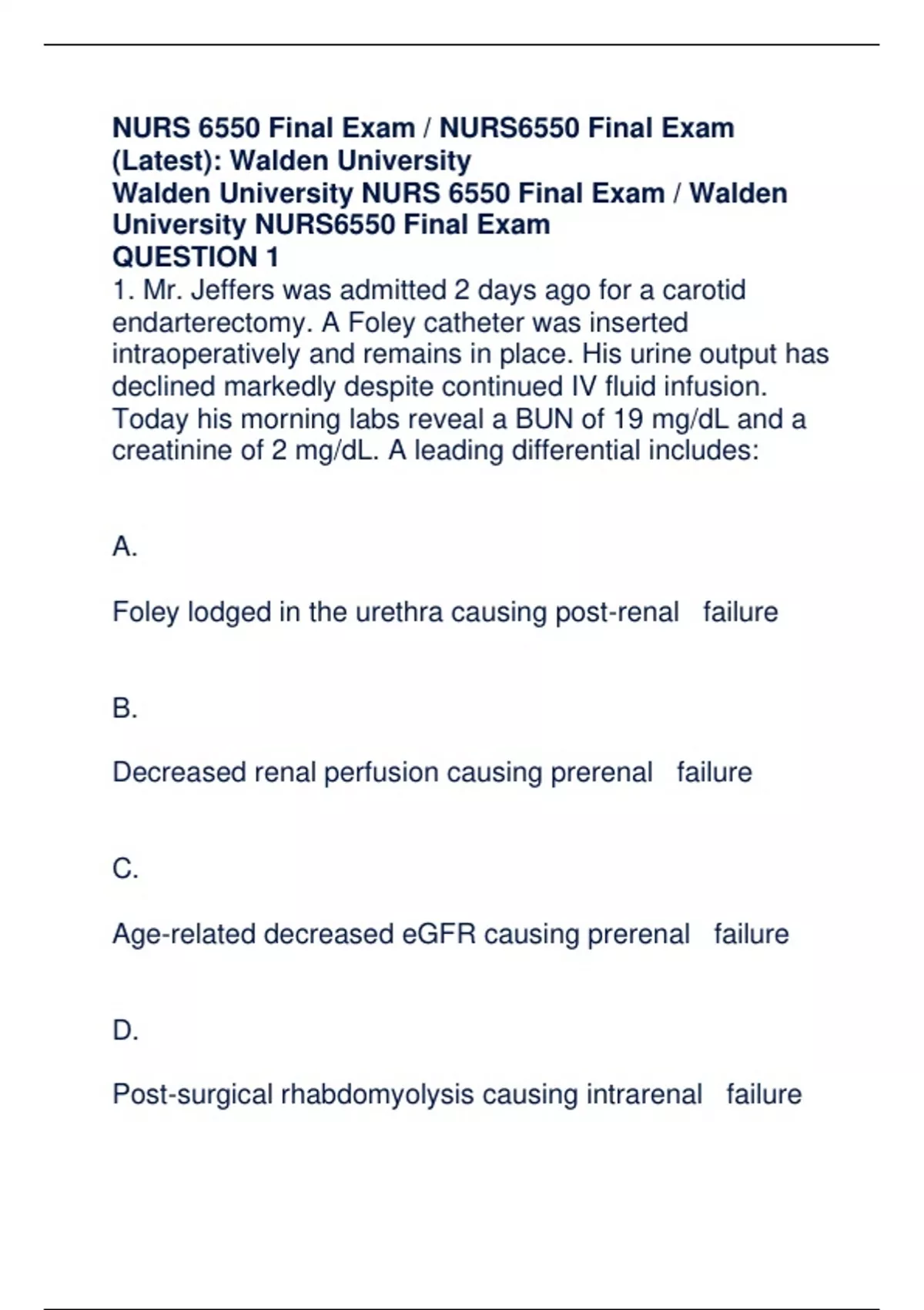NURS 6550 FINAL EXAM NURS6550 FINAL EXAM (3 VERSIONS) (100 CORRECT Q & A IN EACH VERSION, TOTAL300 Q & A)