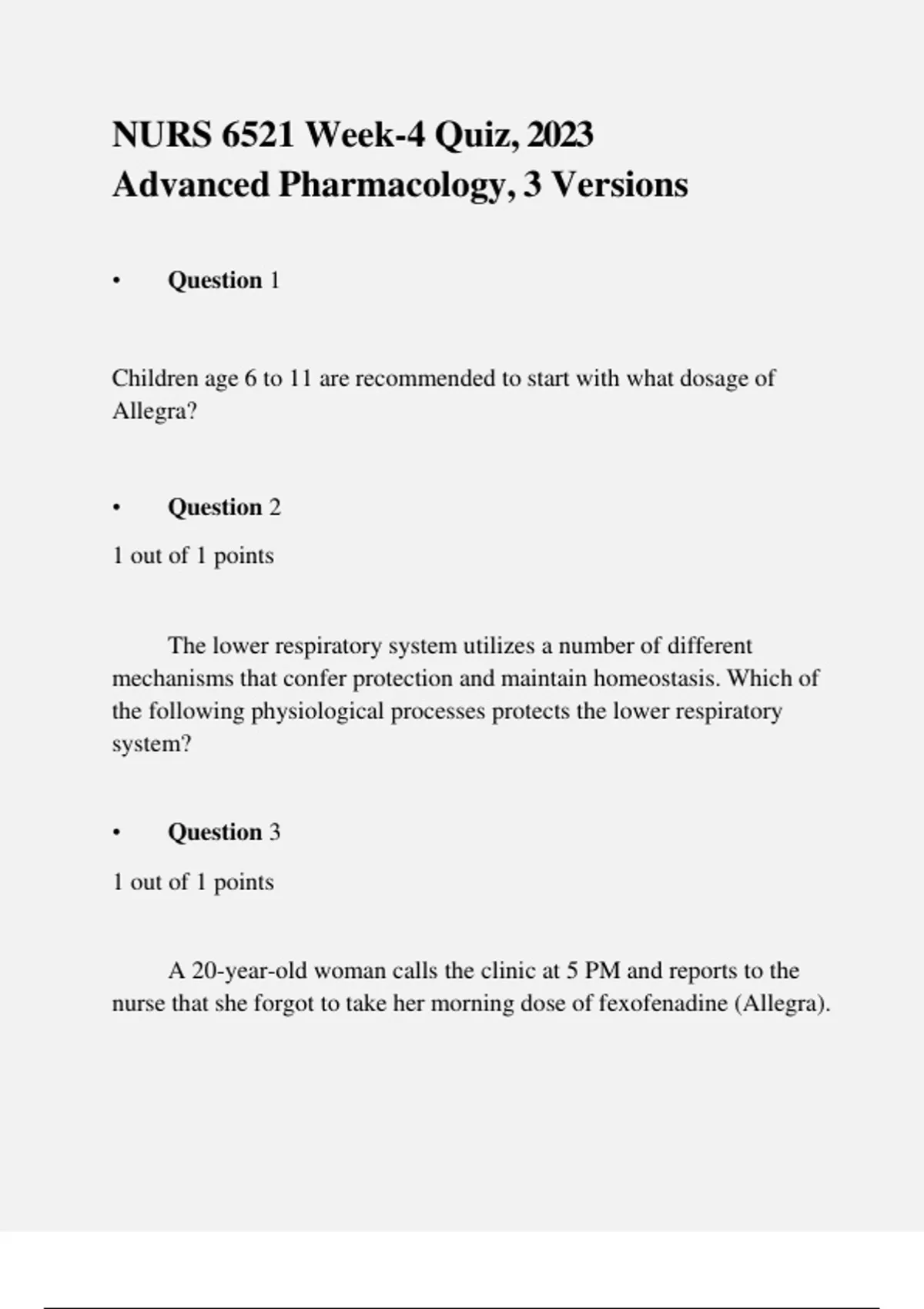 NURS 6521 Week-4 Quiz, 2023 Advanced Pharmacology, 3 Versions