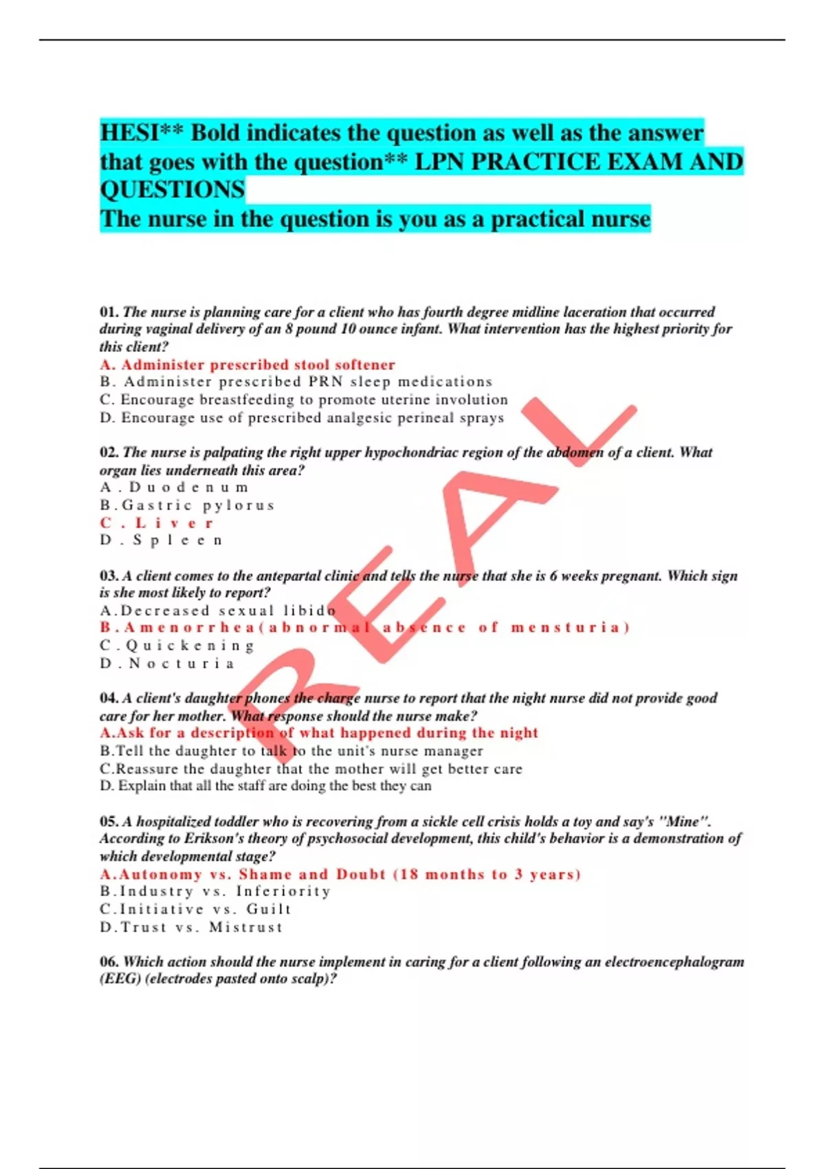 HESI** Bold indicates the question as well as the answer that goes with the question** LPN PRACTICE EXAM AND QUESTIONS The nurse in the question is you as a practical nurse 01. The nurse is planning care for a client who has fourth degree midline laceration that occurred during vaginal delivery of an 8 pound 10 ounce infant. What intervention has the highest priority for this client? A. Administer prescribed stool softener B. Administer prescribed PRN sleep medications C. Encourage breastfeeding to promote uterine involution D. Encourage use of prescribed analgesic perineal sprays 02. The nurse is palpating the right upper hypochondriac region of the abdomen of a client. What organ lies underneath this area? A . D u o d e n u m B . G a s t r i c p y l o r u s C . L i v e r D . S p l e e n 03. A client comes to the antepartal clinic and tells the nurse that she is 6 weeks pregnant. Which sign is she most likely to report? A . D e c r e a s e d s e x u a l l i b i d o B . A m e n o r r h e a ( a b n o r m a l a b s e n c e o f m e n s t u r i a ) C . Q u i c k e n i n g D . N o c t u r i a