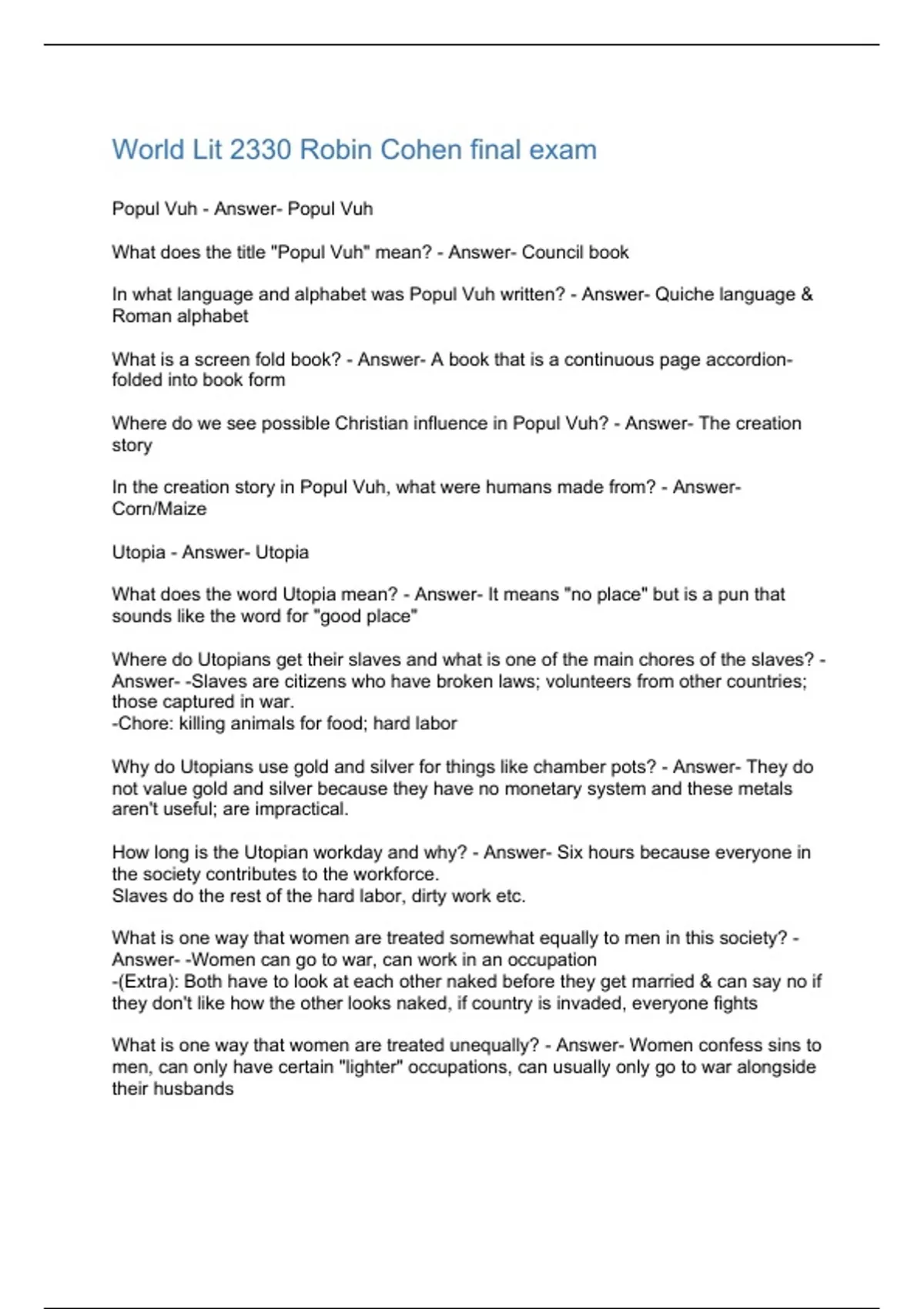 Popul Vuh - Answer- Popul Vuh What does the title "Popul Vuh" mean? - Answer- Council book In what language and alphabet was Popul Vuh written? - Answer- Quiche language & Roman alphabet What is a screen fold book? - Answer- A book that is a continuous page accordion-folded into book form Where do we see possible Christian influence in Popul Vuh? - Answer- The creation story In the creation story in Popul Vuh, what were humans made from? - Answer- Corn/Maize Utopia - Answer- Utopia What does the word Utopia mean? - Answer- It means "no place" but is a pun that sounds like the word for "good place" Where do Utopians get their slaves and what is one of the main chores of the slaves? - Answer- -Slaves are citizens who have broken laws; volunteers from other countries; those captured in war. -Chore: killing animals for food; hard labor Why do Utopians use gold and silver for things like chamber pots? - Answer- They do not value gold and silver because they have no monetary system and these metals aren't useful; are impractical. How long is the Utopian workday and why? - Answer- Six hours because everyone in the society contributes to the workforce. Slaves do the rest of the hard labor, dirty work etc. What is one way that women are treated somewhat equally to men in this society? - Answer- -Women can go to war, can work in an occupation -(Extra): Both have to look at each other naked before they get married & can say no if they don't like how the other looks naked, if country is invaded, everyone fights What is one way that women are treated unequally? - Answer- Women confess sins to men, ca