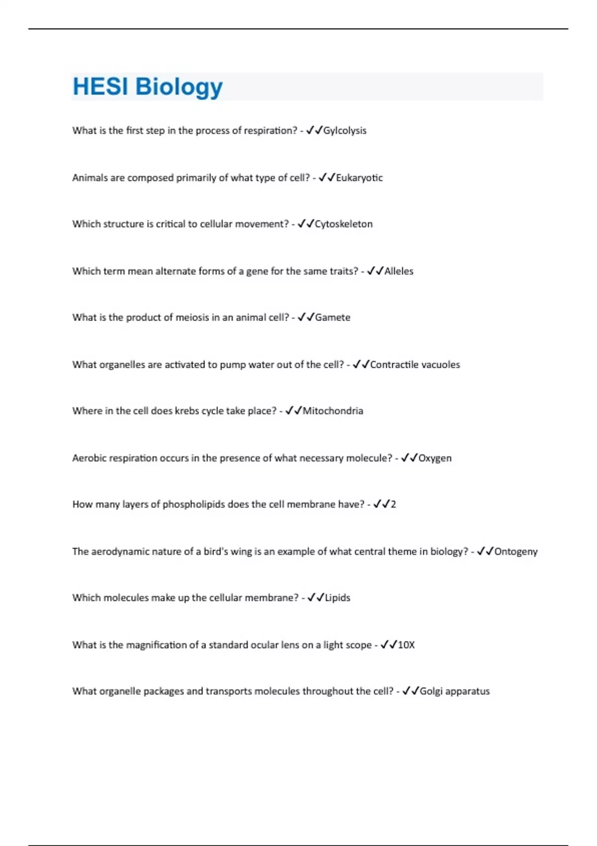 HESI Biology | Questions and Answers with complete solution