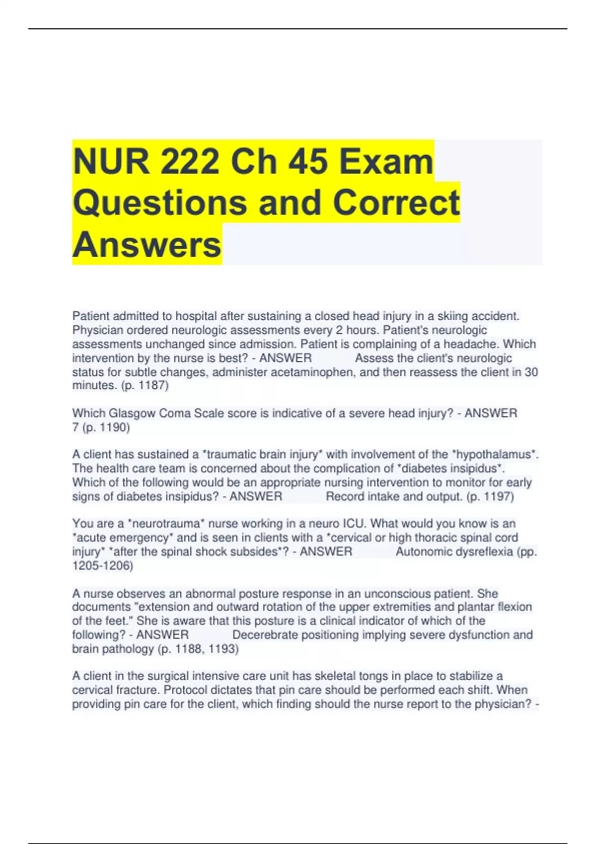 NUR 222 Ch 45 Exam Questions and Correct Answers Patient admitted to hospital after sustaining a closed head injury in a skiing accident. Physician ordered neurologic assessments every 2 hours. Patient's neurologic assessments unchanged since admission. Patient is complaining of a headache. Which intervention by the nurse is best? - ANSWER Assess the client's neurologic status for subtle changes, administer acetaminophen, and then reassess the client in 30 minutes. (p. 1187) Which Glasgow Coma Scale score is indicative of a severe head injury? - ANSWER 7 (p. 1190) A client has sustained a *traumatic brain injury* with involvement of the *hypothalamus*. The health care team is concerned about the complication of *diabetes insipidus*. Which of the following would be an appropriate nursing intervention to monitor for early signs of diabetes insipidus? - ANSWER Record intake and output. (p. 1197) You are a *neurotrauma* nurse working in a neuro ICU. What would you know is an *acute emergency* and is seen in clients with a *cervical or high thoracic spinal cord injury* *after the spinal shock subsides*? - ANSWER Autonomic dysreflexia (pp. ) A nurse observes an abnormal posture response in an unconscious patient. She documents "extension and outward rotation of the upper extremities and plantar flexion of the feet." She is aware that this posture is a clinical indicator of which of the following? - ANSWER Decerebrate positioning implying severe dysfunction and brain pathology (p. 1188, 1193) A client in the surgical intensive care unit has skeletal tongs in place to stabilize a cervical fracture. Protocol dictates that pin care should be performed each shift. When providing pin care for the client, which finding should the nurse report to the physician? - ANSWER A small amount of yellow drainage at the left pin insertion site (p. 1186) The nurse is caring for a client with a spinal cord injury. What test reveals the level of spinal cord injury? - ANSWER Neurologic examination (p. 1190) Level of consciousness (LOC) can be assessed based on criteria in the Glasgow Coma Scale (GCS). Which of the following indicators are assessed in the GCS? Select all that apply. - ANSWER Eye opening; Verbal response; Motor response (p. 1192) The nurse is offering suggestions regarding reproductive options to a husband and para-plegic wife. Which option is most helpful? - ANSWER Conception is not impaired; the birth process is determined with the physician. Osmotic diuretics are an essential intervention for reducing cerebral edema. Which of the following drugs is most frequently prescribed for this situation? - ANSWER Mannitol (p. 1194, 1197)