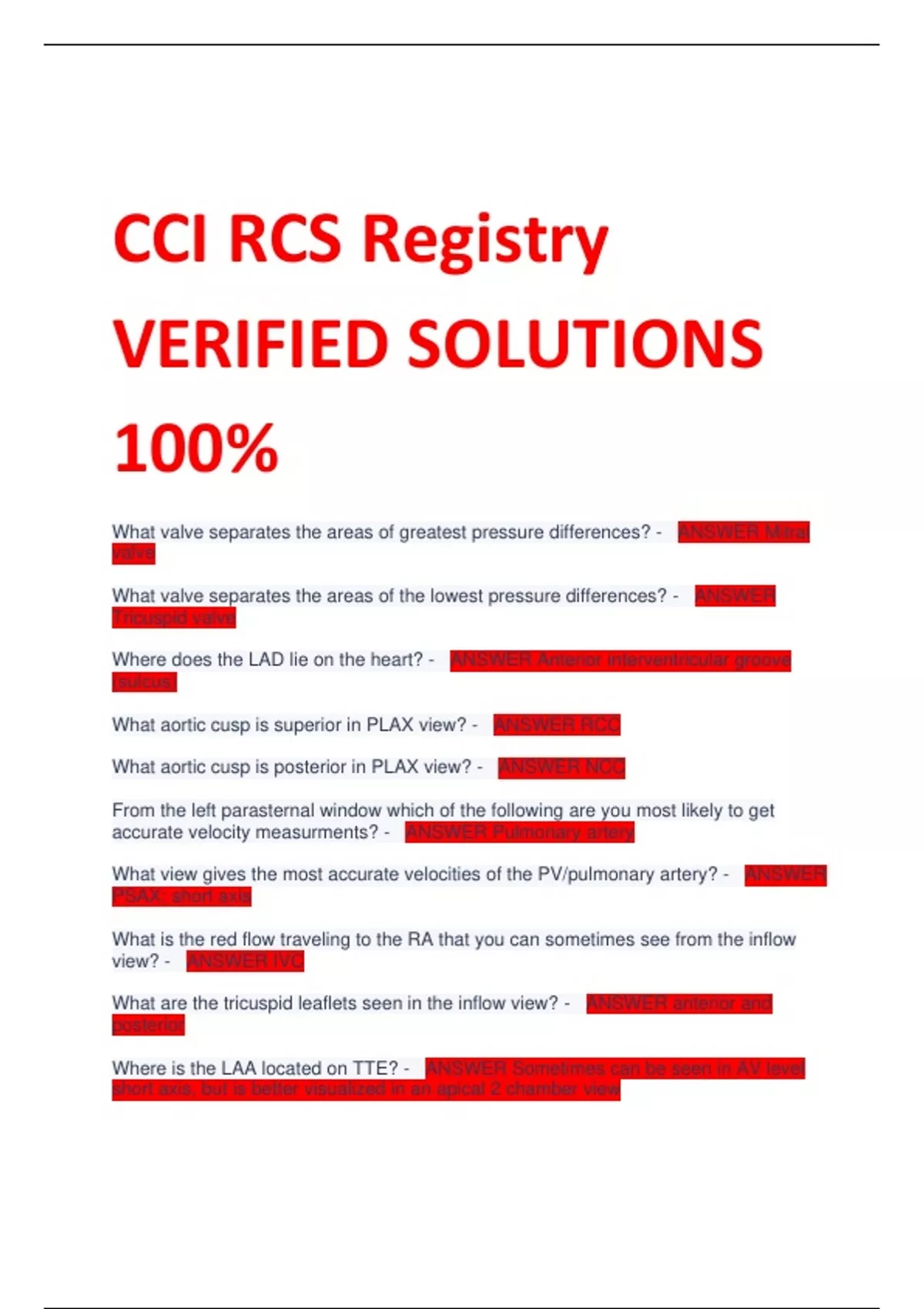 CCI RCS Registry VERIFIED SOLUTIONS 100% What valve separates the areas of greatest pressure differences? - ANSWER Mitral valve What valve separates the areas of the lowest pressure differences? - ANSWER Tricuspid valve Where does the LAD lie on the heart? - ANSWER Anterior interventricular groove (sulcus) What aortic cusp is superior in PLAX view? - ANSWER RCC What aortic cusp is posterior in PLAX view? - ANSWER NCC From the left parasternal window which of the following are you most likely to get accurate velocity measurments? - ANSWER Pulmonary artery What view gives the most accurate velocities of the PV/pulmonary artery? - ANSWER PSAX; short axis What is the red flow traveling to the RA that you can sometimes see from the inflow view? - ANSWER IVC What are the tricuspid leaflets seen in the inflow view? - ANSWER anterior and posterior Where is the LAA located on TTE? - ANSWER Sometimes can be seen in AV level short axis, but is better visualized in an apical 2 chamber view The coronary arteries come off the: - ANSWER Sinuses of Valsalva What is the most anomalous artery? - ANSWER Right coronary During which phase do the coronaries fill? - ANSWER early diastole