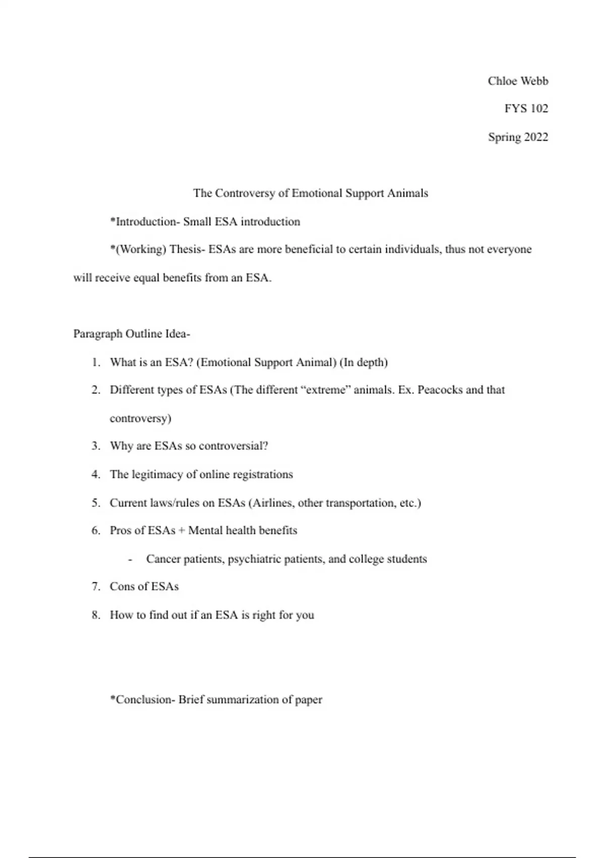 This document is an outline of the final paper for FYS-102 Pets in Society and Media. The topic for this paper is "The Controversy of Emotional Support Animals". It outlines the paragraphs and questions that are discussed in the final paper.