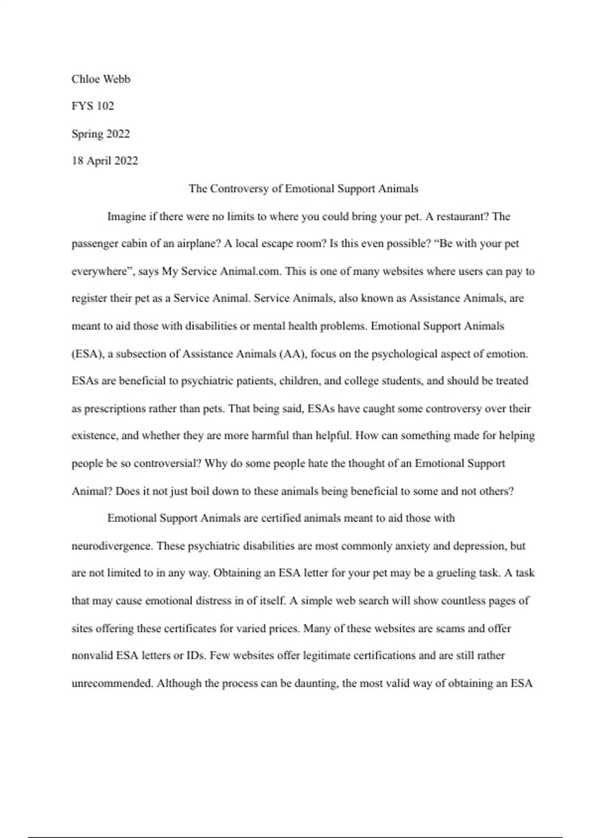 This is a final paper document discussing "The Controversy of Emotional Support Animals". This informative/argumentative paper takes an in-depth look at ESAs and their potential benefits to a variety of populations.