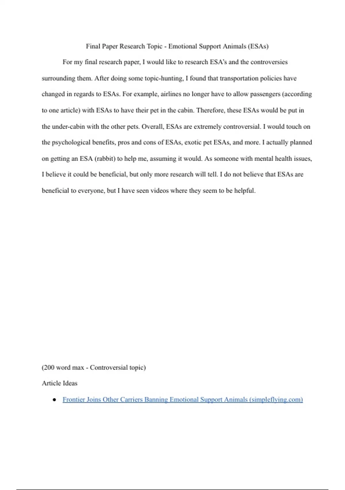 Final Paper Research Topic Paragraph - Emotional Support Animals