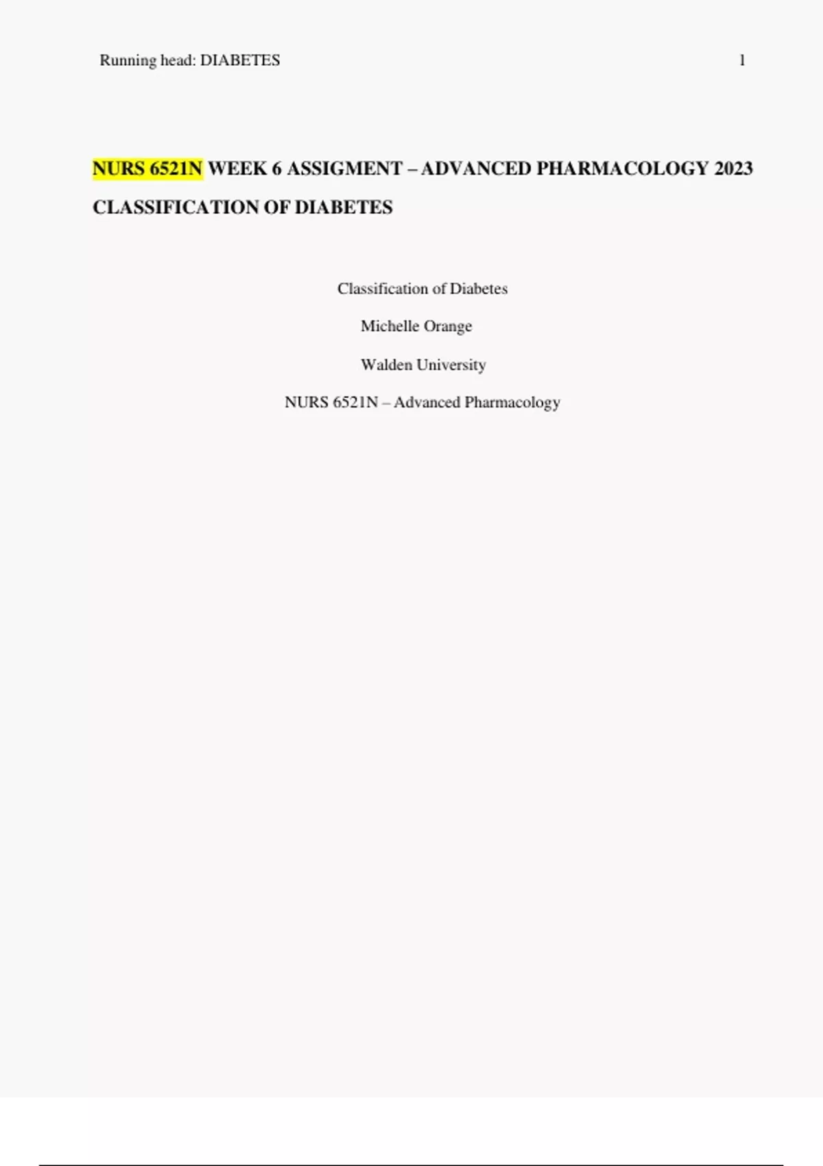 NURS 6521N WEEK 6 ASSIGMENT – ADVANCED PHARMACOLOGY 2023 CLASSIFICATION OF DIABETES