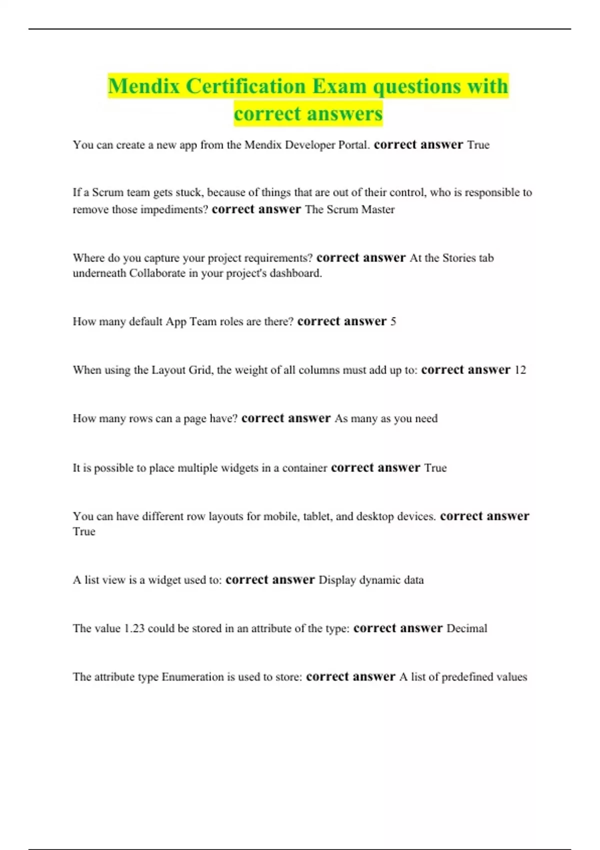 You can create a new app from the Mendix Developer Portal. correct answer True If a Scrum team gets stuck, because of things that are out of their control, who is responsible to remove those impediments? correct answer The Scrum Master Where do you capture your project requirements? correct answer At the Stories tab underneath Collaborate in your project's dashboard. How many default App Team roles are there? correct answer 5 When using the Layout Grid, the weight of all columns must add up to: correct answer 12 How many rows can a page have? correct answer As many as you need It is possible to place multiple widgets in a container correct answer True You can have different row layouts for mobile, tablet, and desktop devices. correct answer True A list view is a widget used to: correct answer Display dynamic data The value 1.23 could be stored in an attribute of the type: correct answer Decimal The attribute type Enumeration is used to store: correct answer A list of predefined values The reference selector is a widget that allows you to: correct answer Select and display an associated object