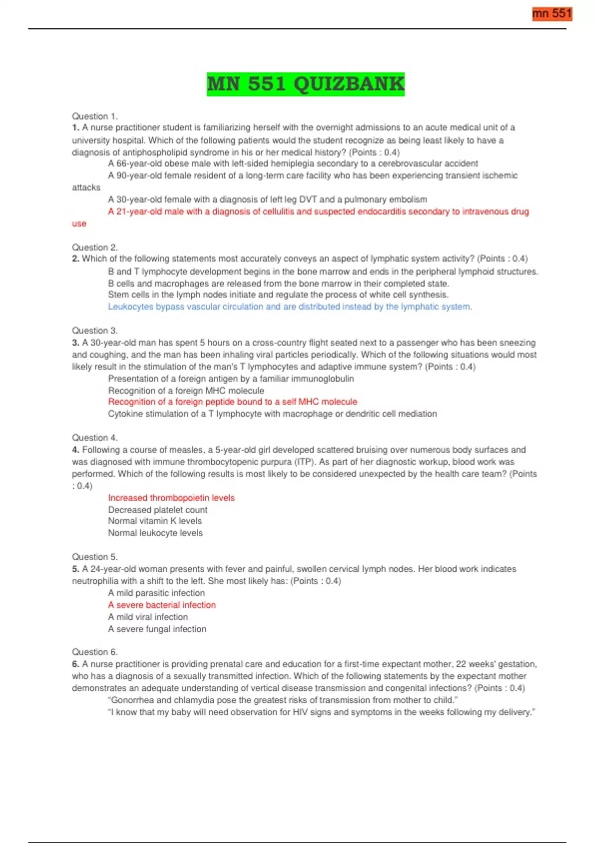 Question 1. 1. A nurse practitioner student is familiarizing herself with the overnight admissions to an acute medical unit of a university hospital. Which of the following patients would the student recognize as being least likely to have a diagnosis of antiphospholipid syndrome in his or her medical history? (Points : 0.4) A 66-year-old obese male with left-sided hemiplegia secondary to a cerebrovascular accident A 90-year-old female resident of a long-term care facility who has been experiencing transient ischemic attacks A 30-year-old female with a diagnosis of left leg DVT and a pulmonary embolism A 21-year-old male with a diagnosis of cellulitis and suspected endocarditis secondary to intravenous drug use Question 2. 2. Which of the following statements most accurately conveys an aspect of lymphatic system activity? (Points : 0.4) B and T lymphocyte development begins in the bone marrow and ends in the peripheral lymphoid structures. B cells and macrophages are released from the bone marrow in their completed state. Stem cells in the lymph nodes initiate and regulate the process of white cell synthesis. Leukocytes bypass vascular circulation and are distributed instead by the lymphatic system. Question 3. 3. A 30-year-old man has spent 5 hours on a cross-country flight seated next to a passenger who has been sneezing and coughing, and the man has been inhaling viral particles periodically. Which of the following situations would most likely result in the stimulation of the man's T lymphocytes and adaptive immune system? (Points : 0.4) Presentation of a foreign antigen by a familiar immunoglobulin Recognition of a foreign MHC molecule Recognition of a foreign peptide bound to a self MHC molecule Cytokine stimulation of a T lymphocyte with macrophage or dendritic cell mediation Question 4. 4. Following a course of measles, a 5-year-old girl developed scattered bruising over numerous body surfaces and was diagnosed with immune thrombocytopenic purpura (ITP). As part of her diagnostic workup, blood work was performed. Which of the following results is most likely to be considered unexpected by the health care team? (Points : 0.4) Increased thrombopoietin levels Decreased platelet count Normal vitamin K levels Normal leukocyte levels Question 5. 5. A 24-year-old woman presents with fever and painful, swollen cervical lymph nodes. Her blood work indicates neutrophilia with a shift to the left. She most likely has: (Points : 0.4) A mild parasitic infection A severe bacterial infection A mild viral infection A severe fungal infection Question 6. 6. A nurse practitioner is providing prenatal care and education for a first-time expectant mother, 22 weeks' gestation, who has a diagnosis of a sexually transmitted infection. Which of the following statements by the expectant mother demonstrates an adequate understanding of vertical disease transmission and congenital infections? (Points : 0.4) “Gonorrhea and chlamydia pose the greatest risks of transmission from mother to child.” “I know that my baby will need observation for HIV signs and symptoms in the weeks following my delivery.” “My baby could become infected either across the placenta or during the birth itself.” “Prophylactic immunization will reduce my baby's chance of being born with an illness.” Question 7. 7. A 16-year-old female has been brought to her primary care nurse practitioner by her mother due to the girl's persistent sore throat and malaise. Which of the following facts revealed in the girl's history and examination would lead the nurse practitioner to rule out infectious mononucleosis? (Points : 0.4) The girl has a temperature of 38.1°C (100.6°F) and has enlarged lymph nodes. Her liver and spleen are both enlarged. Blood work reveals an increased white blood cell count. Chest auscultation reveals crackles in her lower lung fields bilaterally. Question 8. 8. Which of the following phenomena would be least likely to result in activation of the complement system? (Points : 0.4) Recognition of an antibody bound to the surface of a microbe The binding of mannose residues on microbial glycoproteins Activation of Toll-like receptors (TLRs) on complement proteins Direct recognition of microbial proteins Question 9. 9. Which of the following patients is most likely to benefit from transplantation of thymic tissue or major histocompatibility complex (MHC)-compatible bone marrow? (Points : 0.4) A 12-year-old girl with a history of epilepsy and low IgG levels secondary to phenytoin use A 7-year-old boy whose blood work indicates decreased IgA and IgG with increased IgM A 6-year-old boy whose pre-B cells are incapable of translation to normal B cells A 9-year-old girl who has a diagnosis of IgA deficiency Question 10. 10. A 29-year-old construction worker got a sliver under his fingernail four days ago. The affected finger is now reddened, painful, swollen, and warm to the touch. Which of the following hematological processes is most likely occurring in response to the infection? (Points : 0.4) Proliferation of immature neutrophils High circulatory levels of myeloblasts Increased segmented neutrophil production Phagocytosis by myelocytes Question 11. 11. The blood work of a 44-year-old male patient with a diagnosis of liver disease secondary to alcohol abuse indicates low levels of albumin. Which of the following phenomena would a clinician be most justified in anticipating? (Points : 0.4) Impaired immune function Acid-base imbalances Impaired thermoregulation Fluid imbalances Question 12. 12. A 2-year-old girl has had repeated ear and upper respiratory tract infections since she was born. A pediatrician has determined a diagnosis of transient hypogammaglobulinemia of infancy. What is the physiological origin of the child's recurrent infections? (Points : 0.4) Antibody production by plasma cells is compromised because of impaired communication between B and T cells. The child had a congenital absence of immunoglobuli