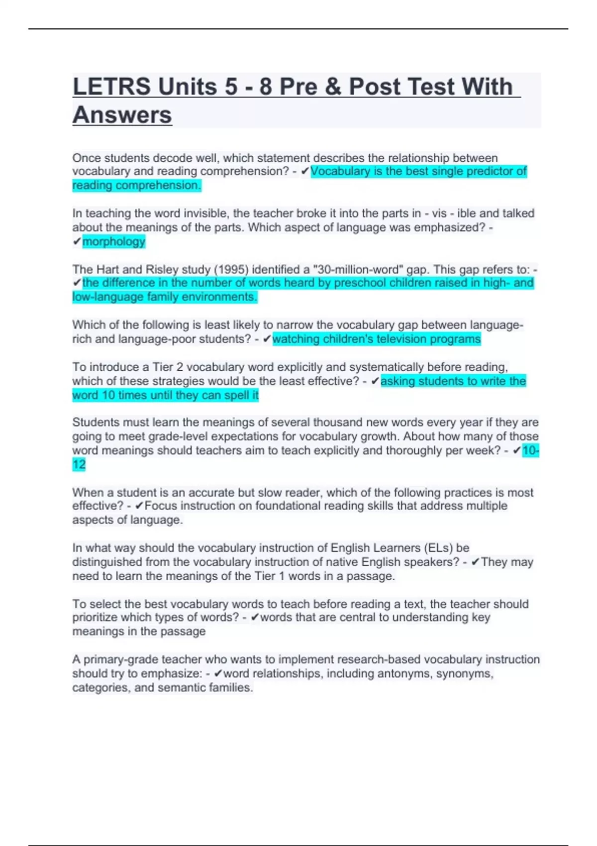 LETRS Units 5 - 8 Pre & Post Test With Answers.