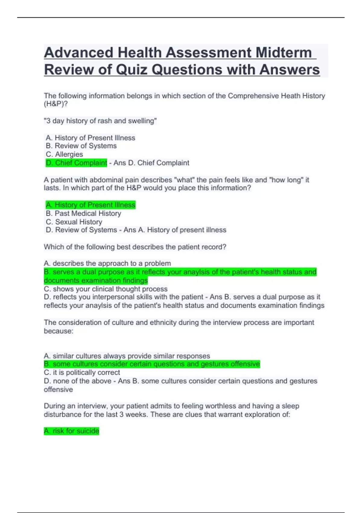 Advanced Health Assessment Midterm Review of Quiz Questions with Answers.