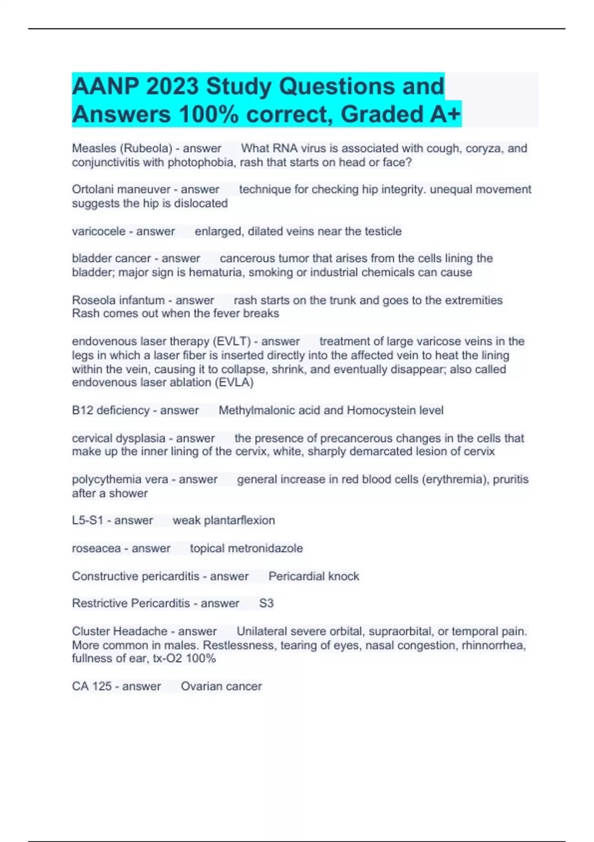AANP 2023 Study Questions and Answers 100% correct, Graded A+ Measles (Rubeola) What RNA virus is associated with cough, coryza, and conjunctivitis with photophobia, rash that starts on head or face? Ortolani maneuver technique for checking hip integrity. unequal movement suggests the hip is dislocated varicocele enlarged, dilated veins near the testicle bladder cancer cancerous tumor that arises from the cells lining the bladder; major sign is hematuria, smoking or industrial chemicals can cause Roseola infantum rash starts on the trunk and goes to the extremities Rash comes out when the fever breaks endovenous laser therapy (EVLT) treatment of large varicose veins in the legs in which a laser fiber is inserted directly into the affected vein to heat the lining within the vein, causing it to collapse, shrink, and eventually disappear; also called endovenous laser ablation (EVLA) B12 deficiency Methylmalonic acid and Homocystein level cervical dysplasia the presence of precancerous changes in the cells that make up the inner lining of the cervix, white, sharply demarcated lesion of cervix polycythemia vera general increase in red blood cells (erythremia), pruritis after a shower L5-S1 weak plantarflexion roseacea topical metronidazole Constructive pericarditis Pericardial knock Restrictive Pericarditis S3 Cluster Headache Unilateral severe orbital, supraorbital, or temporal pain. More common in males. Restlessness, tearing of eyes, nasal congestion, rhinnorrhea, fullness of ear, tx-O2 100% CA 125 Ovarian cancer Deficiency of Niacin Dermatitis, diarrhea, dementia Pertussis treatment in children Azithromycin HLA-DQA or HLA-DQB gene for susceptibility for DM 1 Glyburide Most likely sulfa to cause hypoglycemia Prehn sign elevation of testicles "feels better, less pressure" Dengue fever Supportive Care Hypoparathyroidism Low serum mag Lovastatin First choice for children Vit D dosage in older adults 800 units/day Allergy med that won't cause dizziness Loratadine Meriere's disease first line treatment Antihistamines of Benzo (diazepam) Rhinosinutis can cause? Orbital cellulitis Hemophilia B Prolong PTT Fibroadenoma Most common breast mass from 25-40 years old Treponema pallidum syphilis Wermer syndrome tumors on parathyroid glands Polycythemia vera condition characterized by too many erythrocytes; blood becomes too thick to flow easily through blood vessels, splenomegaly, pruritis after showering Lyme disease bullseye rash, alopecia areata Autoimmune disorder that causes the affected hair follicles to be mistakenly attacked by a person's own immune system; usually begins with one or more small, round, smooth bald patches on the frontal bone of the scalp. Biguanides (Metformin) Works by suppressing hepatic gluconeogenesis and enhancing insulin sensitivity of muscle and fat Sulfonylureas Work by stimulating insulin secretion from the pancreas Hutchinson sign zoster eruption on the tip of the nose When should screening for diabetes start? 45 years old if no symptoms present Reed-Sternberg cells Hodgkin lymphoma (HL) histologic morphology Sever disease (calcaneal apophysitis) A traction-type injury, or osteochondrosis, of the calcaneal apophysis seen in young adolescents. Metformin can cause wha B12 deficiency then depression, fatigue, insomnia Cateracts clouding of the lens, yellow tinted vision Lewy body dementia A form of dementia characterized by an increase in Lewy body cells in the brain. Symptoms include visual hallucinations, momentary loss of attention, falling, and fainting, but also parkinsonian motor features such as bradykinesia, resting tremor, rigidity, and gait difficulty Ramsey Hunt Syndrome Reactivation of cranial nerve VII, facial paralysis, ear pain, vesicular eruption in the auricle and ear canal Why would you give meningococcal vaccine before 11th birthda? Sickle cell anemia (no functioning spleen) Emphysema Structural changes that occur distal to the terminal bronchioles Pinworm treatment Albendazole or pyrantel pamoate or albendazole PO Primary achalasia loss of peristalysis in distal esophagus and failure of LES relaxation with swallowing Polymyositis treatment 1. steroids 2. followed by methotrexate (methotrexate for long-term immunosuppressant therapy) CLL (chronic lymphocytic leukemia) -Chronic with lengthy survival -Primarily a diagnosis of the elderly -Usually B cells -WBC more mature and not functioning properly Vitamin D deficiency Less than 12 mg/ml Acute urticaria fenofenadine, cetirizine, loratadine, first line (second-generation H1 antihistamines) ankylosing spondylitis can cause uveitis tinea cruris Jock itch, terbinafine or butenafine first line (topical) Diagnosing asthma spirometry Hypoparathyroidism hypocalcemia and hyperphosphatemia Screening for gestational diabetes Between 24-28 weeks Indication for PM? Asymptomatic Mobitz II second-degree AV block-risk of progressing to 3rd degree HB Horner syndrome ptosis, miosis, anhidrosis Binocular diplopia, horizontal diplopia on gaze towards affected side? what cranial nerve and muscle? Abducens nerve, lateral rectus muscle First line treatment for pertussis? Azithromycin Lichen planus Pruritic, purple, polygonal planar papules and plaques (6 P's), treatment-topical steroids (topical fluocinonide) Expected clinical finding with high triglycerides? Eruptive xanthomas Rotterdam criteria Diagnosis of PCOS (2 out of 3) - amenorrhea/anovulatory cycles, signs of hyperandrogenism (hirsutism, acne, alopecia, virilization, infertility), polycystic ovaries on US Marfan syndrome Aortic regurgitation Shigella Treatment-azithromycin De Quervain thyroiditis caused by neutrophilic inflammation of the thyroid gland. It is typically viral in origin, and is preceded by an upper respiratory infection Acromegaly -abnormal enlargement of the extremities -insidious onset, with a time to diagnosis on the order of 6-10 years. The classic facial findings, which include enlargement of the supraorbital ridges, mandible and a widened nose gl