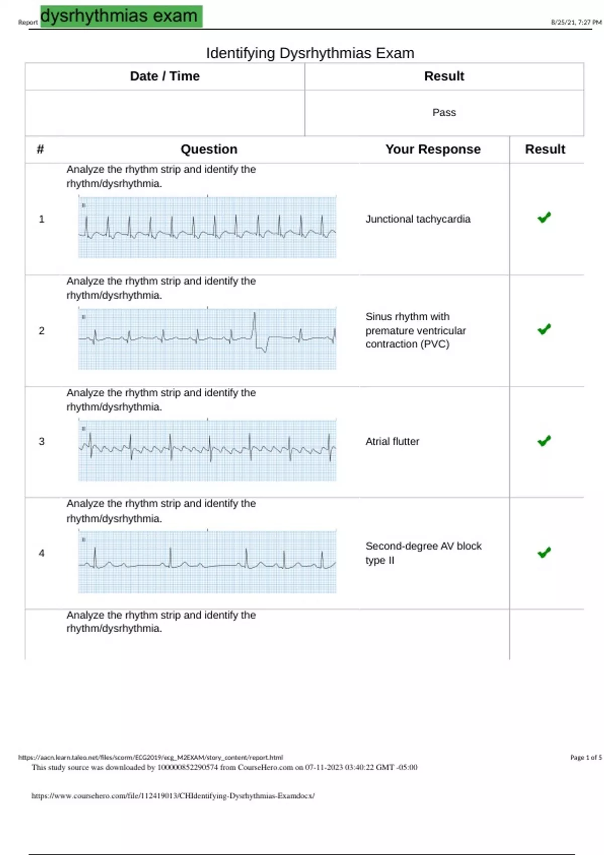 Analyze the rhythm strip and identify the rhythm/dysrhythmia. Junctional tachycardia 2 Analyze the rhythm strip and identify the rhythm/dysrhythmia. Sinus rhythm with premature ventricular contraction (PVC) 3 Analyze the rhythm strip and identify the rhythm/dysrhythmia. Atrial flutter 4 Analyze the rhythm strip and identify the rhythm/dysrhythmia. Second-degree AV block type II Analyze the rhythm strip and identify the rhythm/dysrhythmia. This study source was downloaded by from CourseH on 07-11-2023 03:40:22 GMT -05:00 Report 8/25/21, 7:27 PM 5 Junctional rhythm 6 Analyze the rhythm strip and identify the rhythm/dysrhythmia. 2:1 second-degree AV block 7 Analyze the rhythm strip and identify the rhythm/dysrhythmia. Analyze the rhythm strip and identify the rhythm/dysrhythmia. Atrial flutter 8 Sinus rhythm with premature ventricular contraction (PVC) 9 Analyze the rhythm strip and identify the rhythm/dysrhythmia. Analyze the rhythm strip and identify the rhythm/dysrhythmia. Analyze the rhythm strip and identify the rhythm/dysrhythmia. Idioventricular rhythm 10 Asystole Sinus tachycardia with a