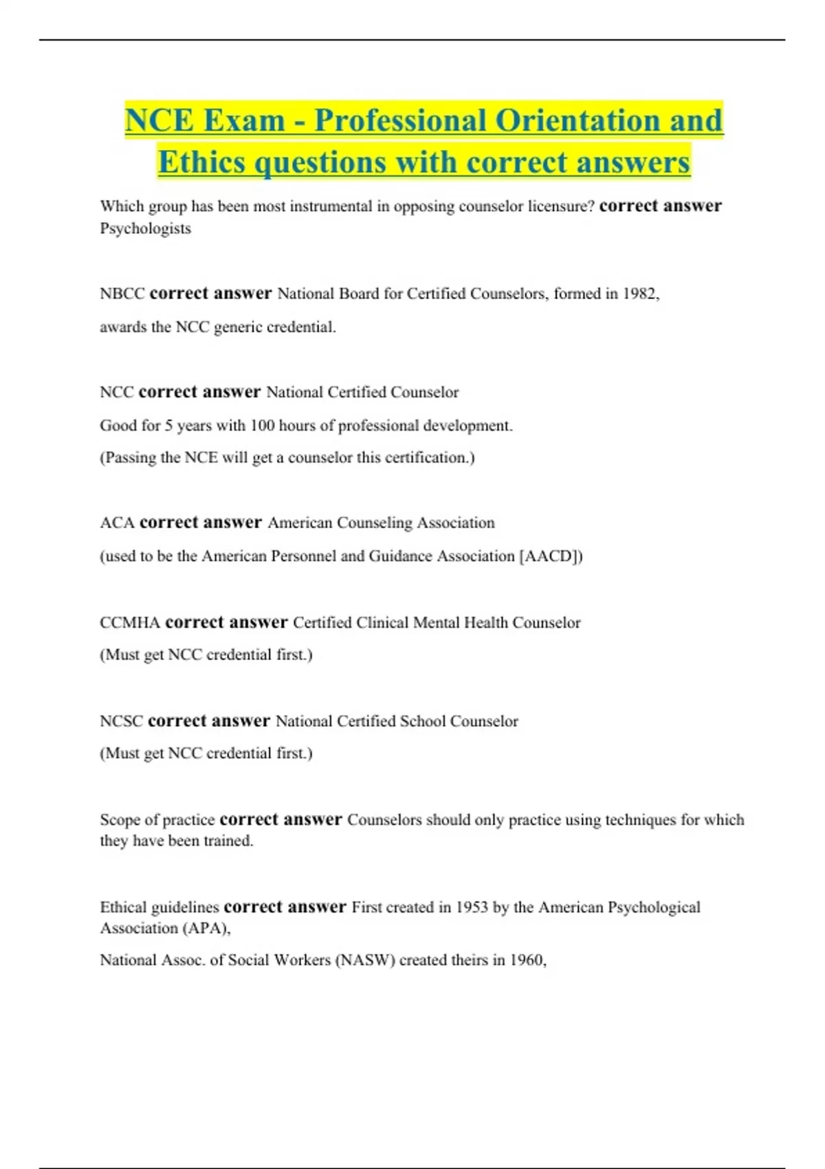 NCE Exam - Professional Orientation and Ethics questions with correct answers
