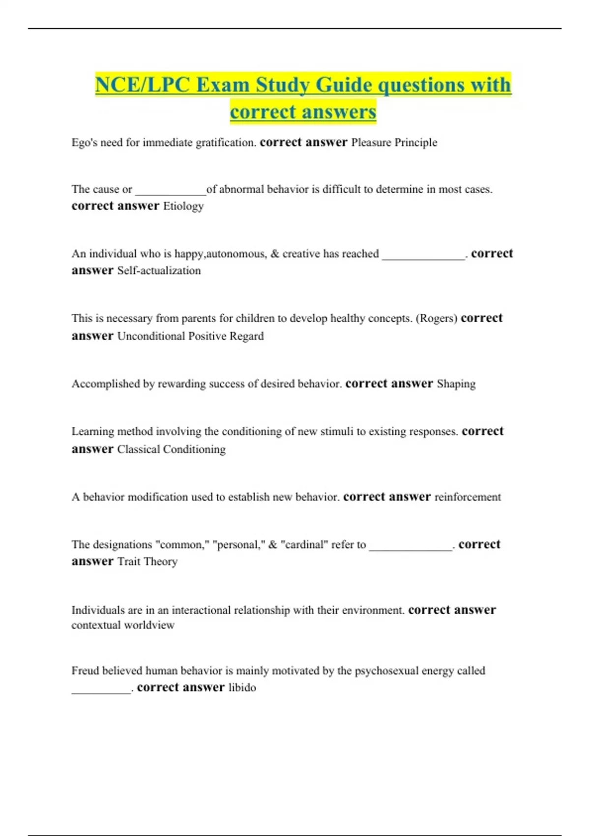 Ego's need for immediate gratification. correct answer Pleasure Principle The cause or ____________of abnormal behavior is difficult to determine in most cases. correct answer Etiology An individual who is happy,autonomous, & creative has reached ______________. correct answer Self-actualization This is necessary from parents for children to develop healthy concepts. (Rogers) correct answer Unconditional Positive Regard Accomplished by rewarding success of desired behavior. correct answer Shaping Learning method involving the conditioning of new stimuli to existing responses. correct answer Classical Conditioning A behavior modification used to establish new behavior. correct answer reinforcement The designations "common," "personal," & "cardinal" refer to ______________. correct answer Trait Theory Individuals are in an interactional relationship with their environment. correct answer contextual worldview Freud believed human behavior is mainly motivated by the psychosexual energy called __________. correct answer libido