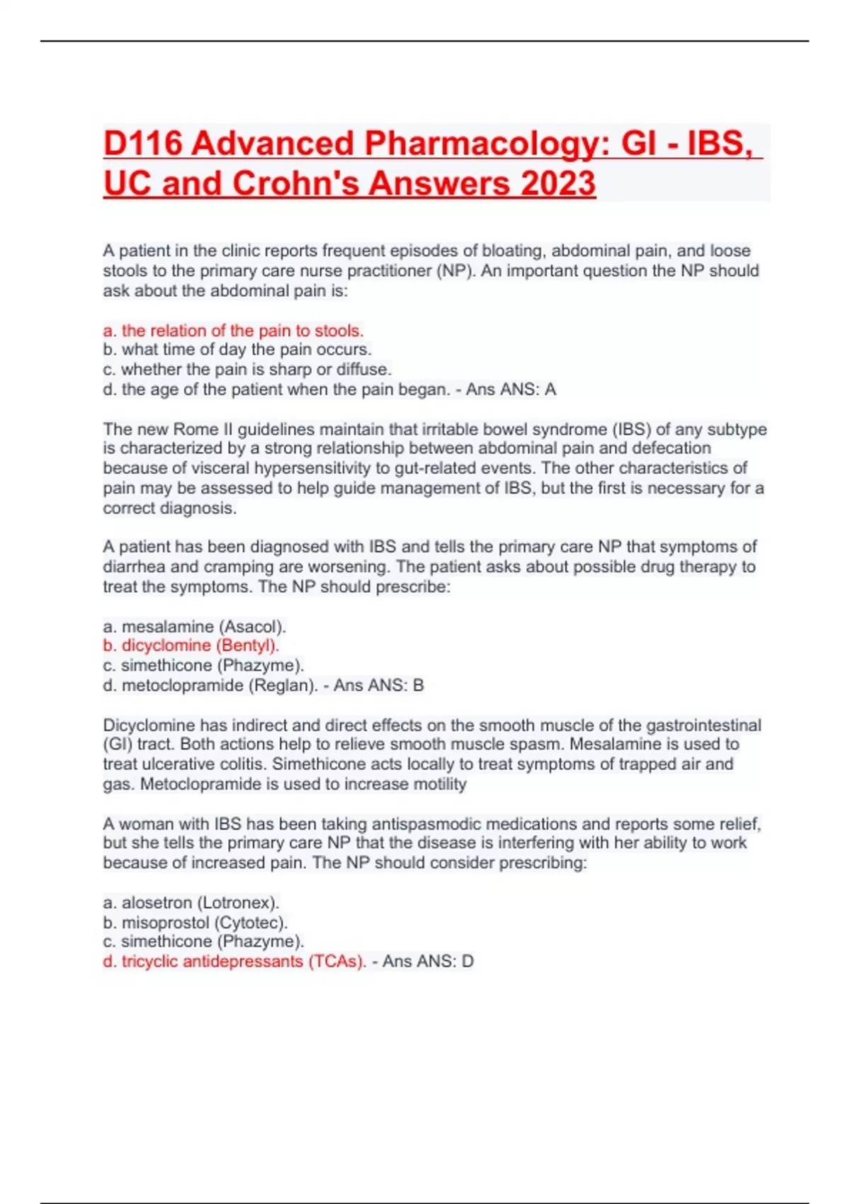 D116 Advanced Pharmacology GI IBS, UC and Crohn s Answers 2023.