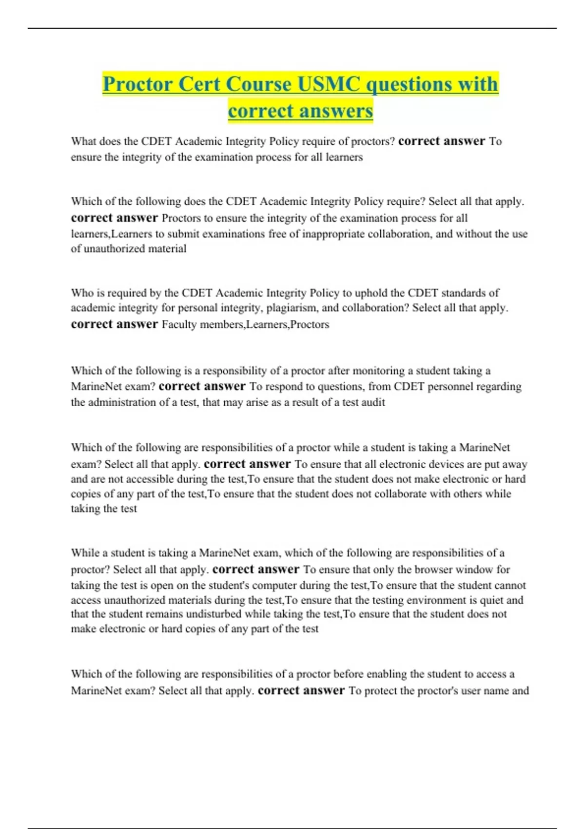 Proctor Cert Course USMC questions with correct answers