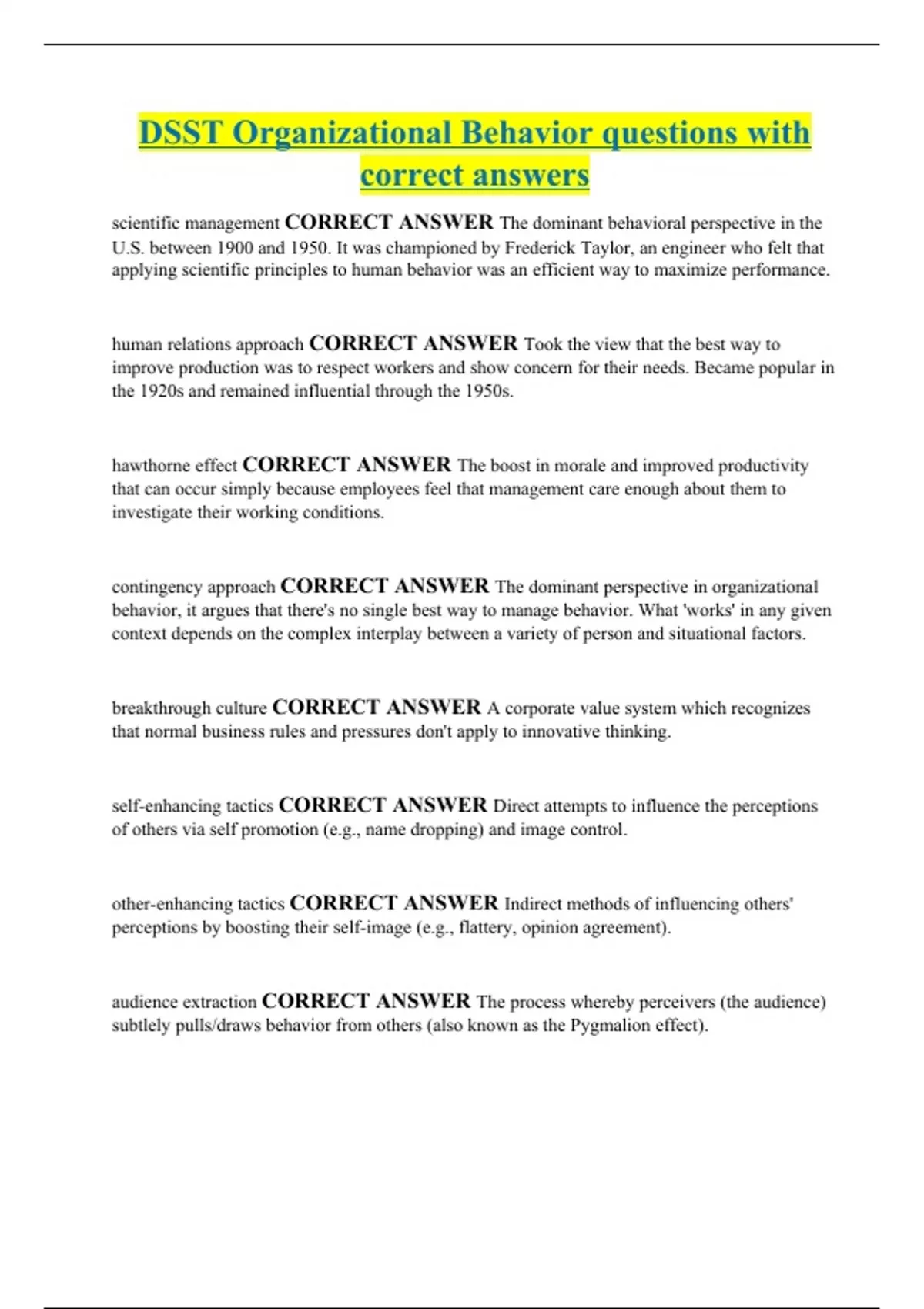 scientific management CORRECT ANSWER The dominant behavioral perspective in the U.S. between 1900 and 1950. It was championed by Frederick Taylor, an engineer who felt that applying scientific principles to human behavior was an efficient way to maximize performance. human relations approach CORRECT ANSWER Took the view that the best way to improve production was to respect workers and show concern for their needs. Became popular in the 1920s and remained influential through the 1950s. hawthorne effect CORRECT ANSWER The boost in morale and improved productivity that can occur simply because employees feel that management care enough about them to investigate their working conditions. contingency approach CORRECT ANSWER The dominant perspective in organizational behavior, it argues that there's no single best way to manage behavior. What 'works' in any given context depends on the complex interplay between a variety of person and situational factors. breakthrough culture CORRECT ANSWER A corporate value system which recognizes that normal business rules and pressures don't apply to innovative thinking. self-enhancing tactics CORRECT ANSWER Direct attempts to influence the perceptions of others via self promotion (e.g., name dropping) and image control. other-enhancing tactics CORRECT ANSWER Indirect methods of influencing others' perceptions by boosting their self-image (e.g., flattery, opinion agreement). audience extraction CORRECT ANSWER The process whereby perceivers (the audience) subtlely pulls/draws behavior from others (also known as the Pygmalion effect).
