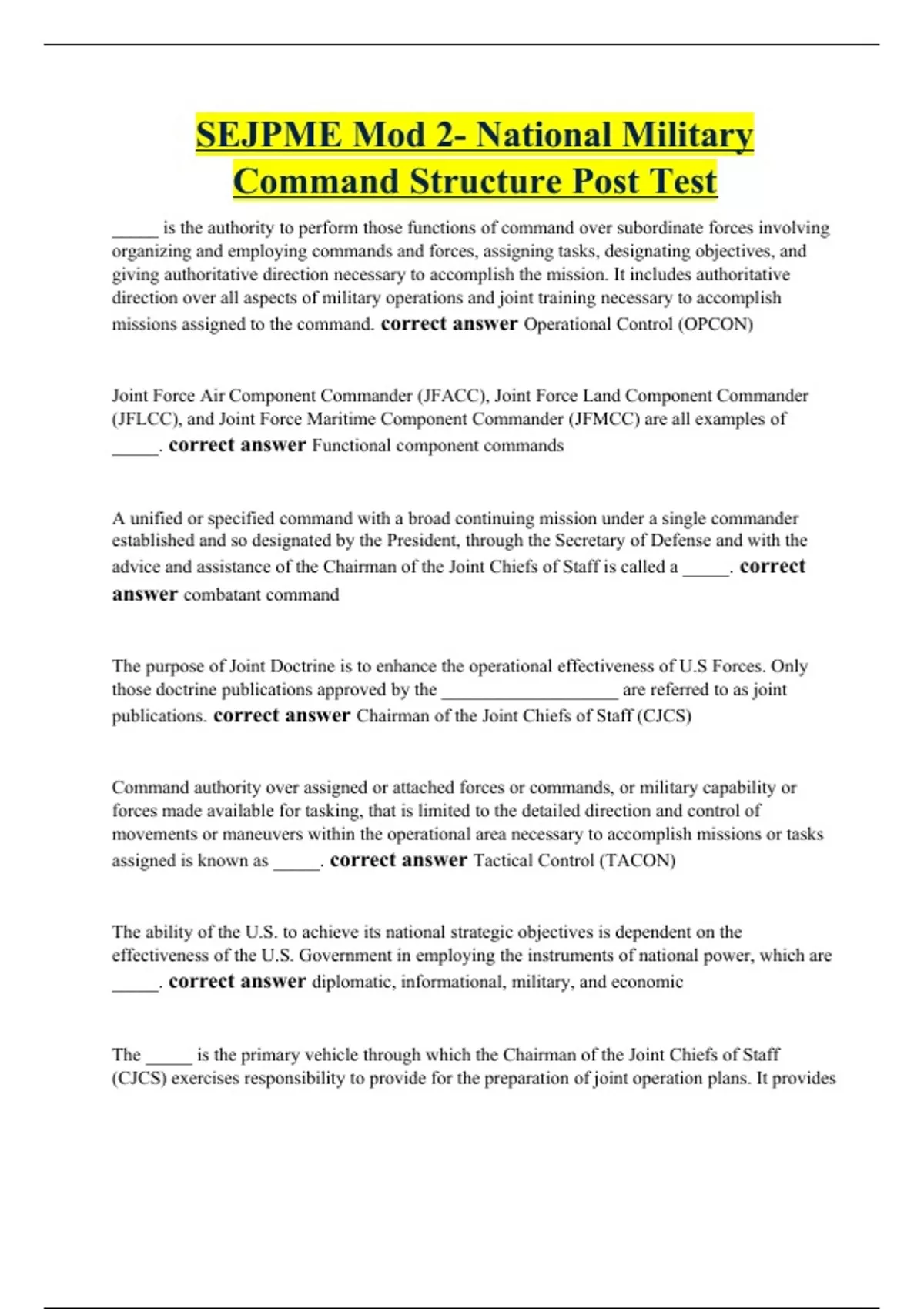 _____ is the authority to perform those functions of command over subordinate forces involving organizing and employing commands and forces, assigning tasks, designating objectives, and giving authoritative direction necessary to accomplish the mission. It includes authoritative direction over all aspects of military operations and joint training necessary to accomplish missions assigned to the command. correct answer Operational Control (OPCON) Joint Force Air Component Commander (JFACC), Joint Force Land Component Commander (JFLCC), and Joint Force Maritime Component Commander (JFMCC) are all examples of _____. correct answer Functional component commands A unified or specified command with a broad continuing mission under a single commander established and so designated by the President, through the Secretary of Defense and with the advice and assistance of the Chairman of the Joint Chiefs of Staff is called a _____. correct answer combatant command The purpose of Joint Doctrine is to enhance the operational effectiveness of U.S Forces. Only those doctrine publications approved by the ___________________ are referred to as joint publications. correct answer Chairman of the Joint Chiefs of Staff (CJCS) Command authority over assigned or attached forces or commands, or military capability or forces made available for tasking, that is limited to the detailed direction and control of movements or maneuvers within the operational area necessary to accomplish missions or tasks assigned is known as _____. correct answer Tactical Control (TACON) The ability of the U.S. to achieve its national strategic objectives is dependent on the effectiveness of the U.S. Government in employing the instruments of national power, which are _____. correct answer diplomatic, informational, military, and economic The _____ is the primary vehicle through which the Chairman of the Joint Chiefs of Staff