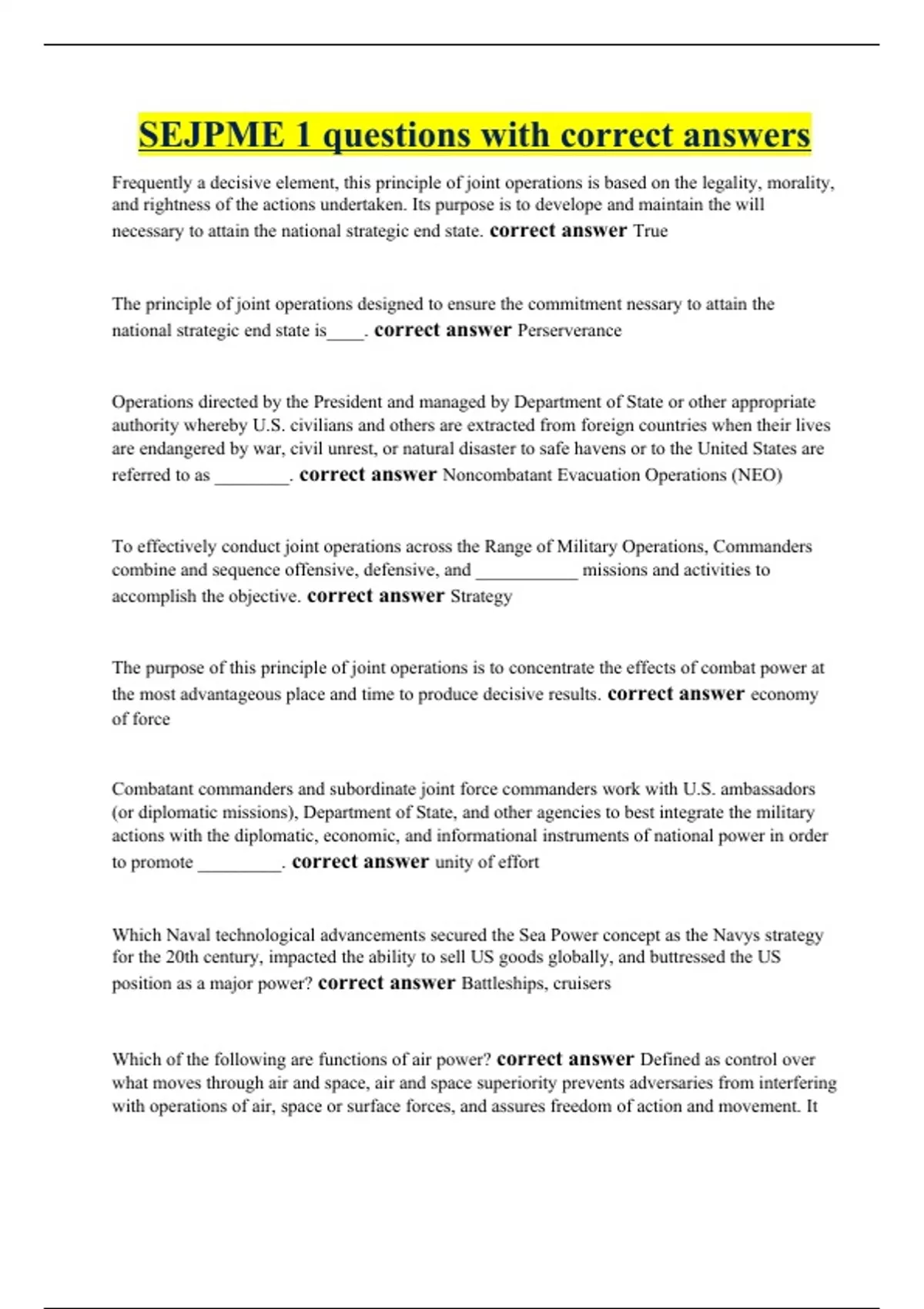 Frequently a decisive element, this principle of joint operations is based on the legality, morality, and rightness of the actions undertaken. Its purpose is to develope and maintain the will necessary to attain the national strategic end state. correct answer True The principle of joint operations designed to ensure the commitment nessary to attain the national strategic end state is____. correct answer Perserverance Operations directed by the President and managed by Department of State or other appropriate authority whereby U.S. civilians and others are extracted from foreign countries when their lives are endangered by war, civil unrest, or natural disaster to safe havens or to the United States are referred to as ________. correct answer Noncombatant Evacuation Operations (NEO) To effectively conduct joint operations across the Range of Military Operations, Commanders combine and sequence offensive, defensive, and ___________ missions and activities to accomplish the objective. correct answer Strategy The purpose of this principle of joint operations is to concentrate the effects of combat power at the most advantageous place and time to produce decisive results. correct answer economy of force Combatant commanders and subordinate joint force commanders work with U.S. ambassadors (or diplomatic missions), Department of State, and other agencies to best integrate the military actions with the diplomatic, economic, and informational instruments of national power in order to promote _________. correct answer unity of effort Which Naval technological advancements secured the Sea Power concept as the Navys strategy for the 20th century, impacted the ability to sell US goods globally, and buttressed the US position as a major power? correct answer Battleships,
