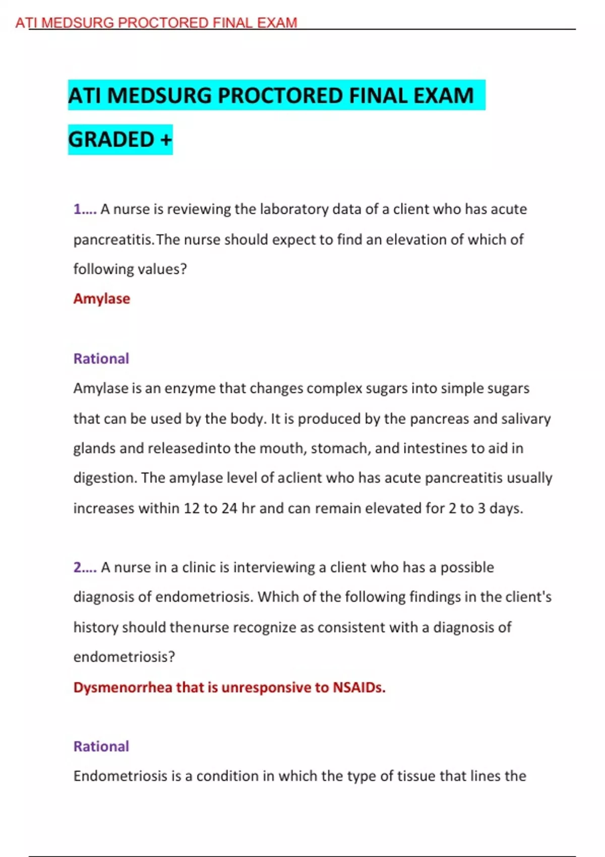 …. A nurse is reviewing the laboratory data of a client who has acute pancreatitis. The nurse should expect to find an elevation of which of following values? Amylase Rational Amylase is an enzyme that changes complex sugars into simple sugars that can be used by the body. It is produced by the pancreas and salivary glands and released into the mouth, stomach, and intestines to aid in digestion. The amylase level of a client who has acute pancreatitis usually increases within 12 to 24 hr and can remain elevated for 2 to 3 days. 2…. A nurse in a clinic is interviewing a client who has a possible diagnosis of endometriosis. Which of the following findings in the client's history should the nurse recognize as consistent with a diagnosis of endometriosis? Dysmenorrhea that is unresponsive to NSAIDs. Rational Endometriosis is a condition in which the type of tissue that lines the uterus implants in locations outside the uterus. This typically causes pelvic pain around the time of the menstrual period but can cause pain at other times in the cycle. The discomfort is often unrelieved by the use of NSAIDs. 3…. A rehabilitation nurse is caring for a client who has had a spinal cord injury that resulted in paraplegia. After a week on the unit, the nurse notes that the client is withdrawn and increasingly resistant to rehabilitative efforts by the staff. Which of the following actions should the nurse take? Establish a plan of care with the client that sets attainable goals.