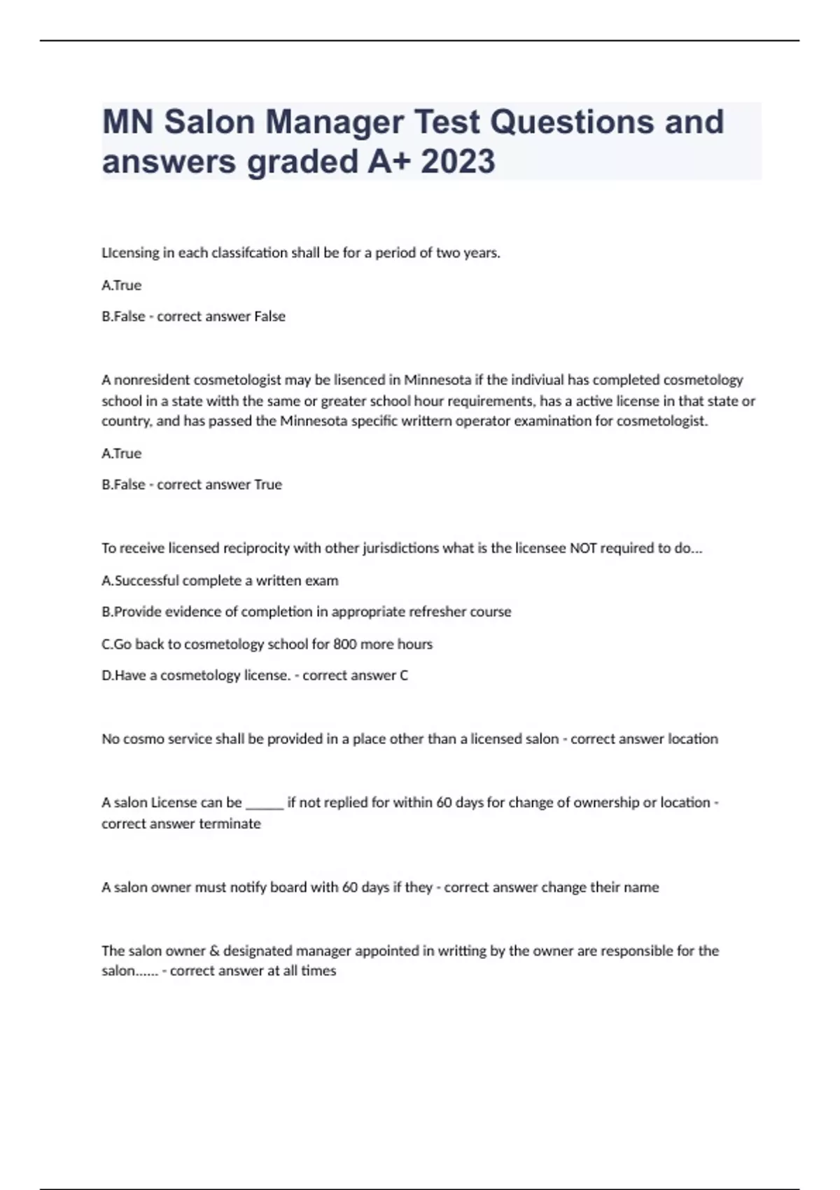 MN Salon Manager Test Questions and answers graded A+ 2023 LIcensing in each classifcation shall be for a period of two years. A.True B.False - correct answer False A nonresident cosmetologist may be lisenced in Minnesota if the indiviual has completed cosmetology school in a state witth the same or greater school hour requirements, has a active license in that state or country, and has passed the Minnesota specific writtern operator examination for cosmetologist. A.True B.False - correct answer True To receive licensed reciprocity with other jurisdictions what is the licensee NOT required to do... A.Successful complete a written exam B.Provide evidence of completion in appropriate refresher course C.Go back to cosmetology school for 800 more hours D.Have a cosmetology license. - correct answer C No cosmo service shall be provided in a place other than a licensed salon - correct answer location A salon License can be _____ if not replied for within 60 days for change of ownership or location - correct answer terminate A salon owner must notify board with 60 days if they - correct answer change their name The salon owner & designated manager appointed in writting by the owner are responsible for the salon...... - correct answer at all times