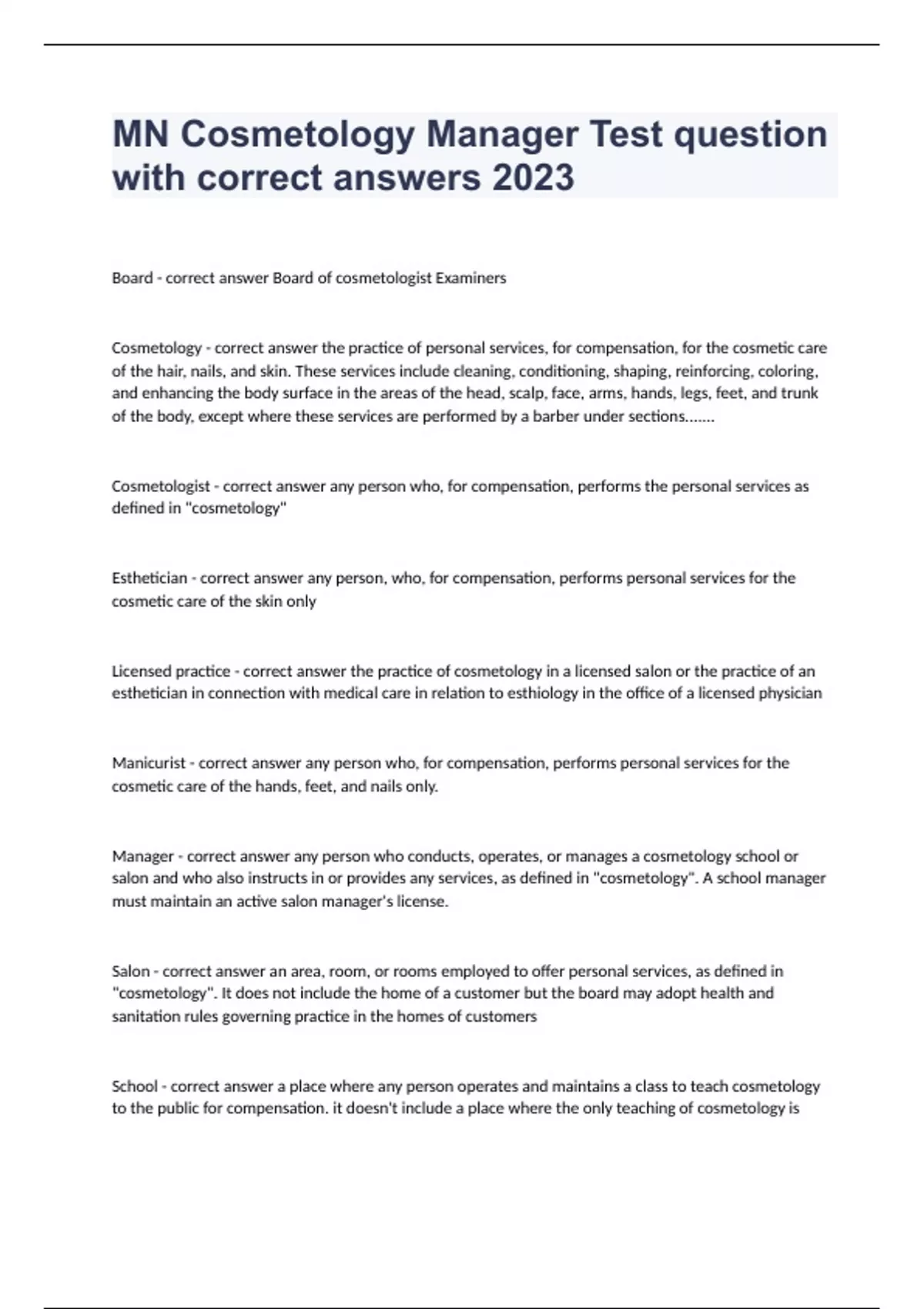 MN Cosmetology Manager Test question with correct answers 2023 Board - correct answer Board of cosmetologist Examiners Cosmetology - correct answer the practice of personal services, for compensation, for the cosmetic care of the hair, nails, and skin. These services include cleaning, conditioning, shaping, reinforcing, coloring, and enhancing the body surface in the areas of the head, scalp, face, arms, hands, legs, feet, and trunk of the body, except where these services are performed by a barber under sections....... Cosmetologist - correct answer any person who, for compensation, performs the personal services as defined in "cosmetology" Esthetician - correct answer any person, who, for compensation, performs personal services for the cosmetic care of the skin only Licensed practice - correct answer the practice of cosmetology in a licensed salon or the practice of an esthetician in connection with medical care in relation to esthiology in the office of a licensed physician Manicurist - correct answer any person who, for compensation, performs personal services for the cosmetic care of the hands, feet, and nails only. Manager - correct answer any person who conducts, operates, or manages a cosmetology school or salon and who also instructs in or provides any services, as defined in "cosmetology". A school manager must maintain an active salon manager's license. Salon - correct answer an area, room, or rooms employed to offer personal services, as defined in "cosmetology". It does not include the home of a customer but the board may adopt health and sanitation rules governing practice in the homes of customers School - correct answer a place where any person operates and maintains a class to teach cosmetology to the public for compensation. it doesn't include a place where the only teaching of cosmetology is
