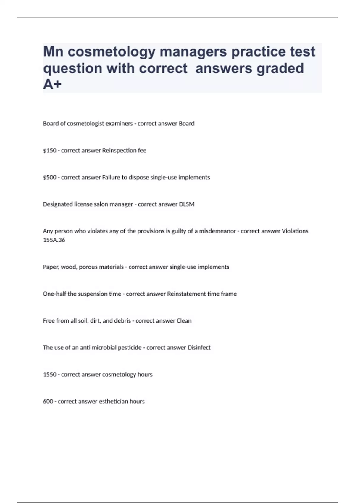 Mn cosmetology managers practice test question with correct answers graded A+Board of cosmetologist examiners - correct answer Board $150 - correct answer Reinspection fee $500 - correct answer Failure to dispose single-use implements Designated license salon manager - correct answer DLSM Any person who violates any of the provisions is guilty of a misdemeanor - correct answer Violations 155A.36 Paper, wood, porous materials - correct answer single-use implements One-half the suspension time - correct answer Reinstatement time frame Free from all soil, dirt, and debris - correct answer Clean The use of an anti microbial pesticide - correct answer Disinfect 1550 - correct answer cosmetology hours 600 - correct answer esthetician hours