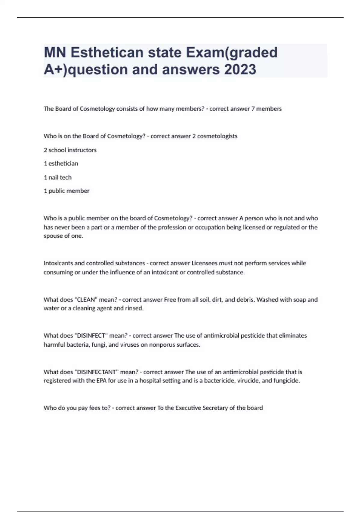 MN Esthetican state Exam(graded A+)question and answers 2023The Board of Cosmetology consists of how many members? - correct answer 7 members Who is on the Board of Cosmetology? - correct answer 2 cosmetologists 2 school instructors 1 esthetician 1 nail tech 1 public member Who is a public member on the board of Cosmetology? - correct answer A person who is not and who has never been a part or a member of the profession or occupation being licensed or regulated or the spouse of one. Intoxicants and controlled substances - correct answer Licensees must not perform services while consuming or under the influence of an intoxicant or controlled substance. What does "CLEAN" mean? - correct answer Free from all soil, dirt, and debris. Washed with soap and water or a cleaning agent and rinsed. What does "DISINFECT" mean? - correct answer The use of antimicrobial pesticide that eliminates harmful bacteria, fungi, and viruses on nonporus surfaces. What does "DISINFECTANT" mean? - correct answer The use of an antimicrobial pesticide that is registered with the EPA for use in a hospital setting and is a bactericide, virucide, and fungicide. Who do you pay fees to? - correct answer To the Executive Secretary of the board