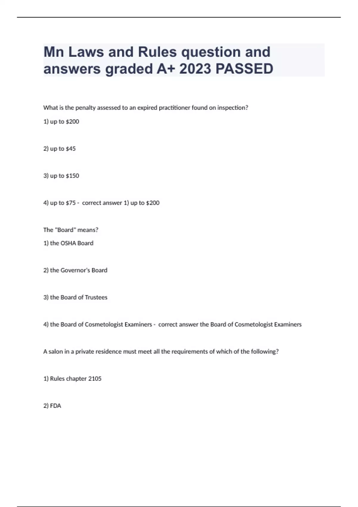 Mn Laws and Rules question and answers graded A+ 2023 PASSEDWhat is the penalty assessed to an expired practitioner found on inspection? 1) up to $200 2) up to $45 3) up to $150 4) up to $75 - correct answer 1) up to $200 The "Board" means? 1) the OSHA Board 2) the Governor's Board 3) the Board of Trustees 4) the Board of Cosmetologist Examiners - correct answer the Board of Cosmetologist Examiners A salon in a private residence must meet all the requirements of which of the following? 1) Rules chapter 2105 2) FDA