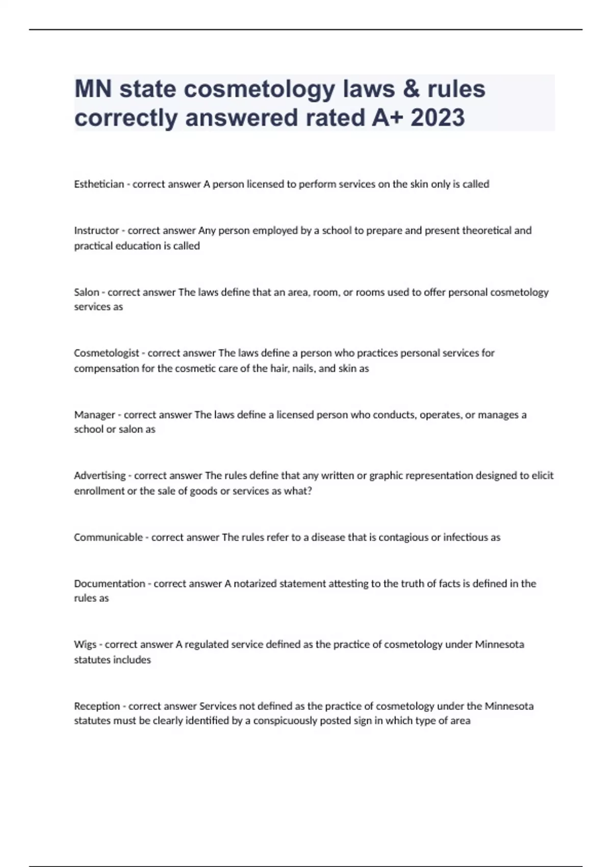 MN state cosmetology laws & rules correctly answered rated A+ 2023Esthetician - correct answer A person licensed to perform services on the skin only is called Instructor - correct answer Any person employed by a school to prepare and present theoretical and practical education is called Salon - correct answer The laws define that an area, room, or rooms used to offer personal cosmetology services as Cosmetologist - correct answer The laws define a person who practices personal services for compensation for the cosmetic care of the hair, nails, and skin as Manager - correct answer The laws define a licensed person who conducts, operates, or manages a school or salon as Advertising - correct answer The rules define that any written or graphic representation designed to elicit enrollment or the sale of goods or services as what? Communicable - correct answer The rules refer to a disease that is contagious or infectious as Documentation - correct answer A notarized statement attesting to the truth of facts is defined in the rules as Wigs - correct answer A regulated service defined as the practice of cosmetology under Minnesota statutes includes Reception - correct answer Services not defined as the practice of cosmetology under the Minnesota statutes must be clearly identified by a conspicuously posted sign in which type of area Have separate entrances and phone numbers - correct answer Professional salons and spas within a school are required to Board of Cosmetology Examiners - correct answer The current definition of "Board" according to cosmetology law is Completely partitioned off from living quarters - correct answer If a salon is in the residence of a person practicing cosmetology, the rooms used for cosmetology should be: True - correct answer Every school should have at least one heat cap 12 - correct answer There shall be how many towels per student in a licensed Minnesota school 2700 hours - correct answer A licensed cosmetologist, manicurist, or esthetician may apply for a managers license after completing ______ of work experience in a salon Health - correct answer Standardized testing is used for cosmetology licensing to safeguard the ___ and safety of the consumers Three - correct answer Duration of licenses is for a period of how many years Competency - correct answer The law requires standardized testing to determine the ______ of the applicant 10 - correct answer Community education means a program of personal grooming taught by a licensed cosmetologist, manicurist, or esthetician of less than ______ hours duration, offered on a periodic basis Minnesota - correct answer Standardized testing used for licensing must include subject matter related to ___ law Sweep hair - correct answer Immediately following a haircut you must: