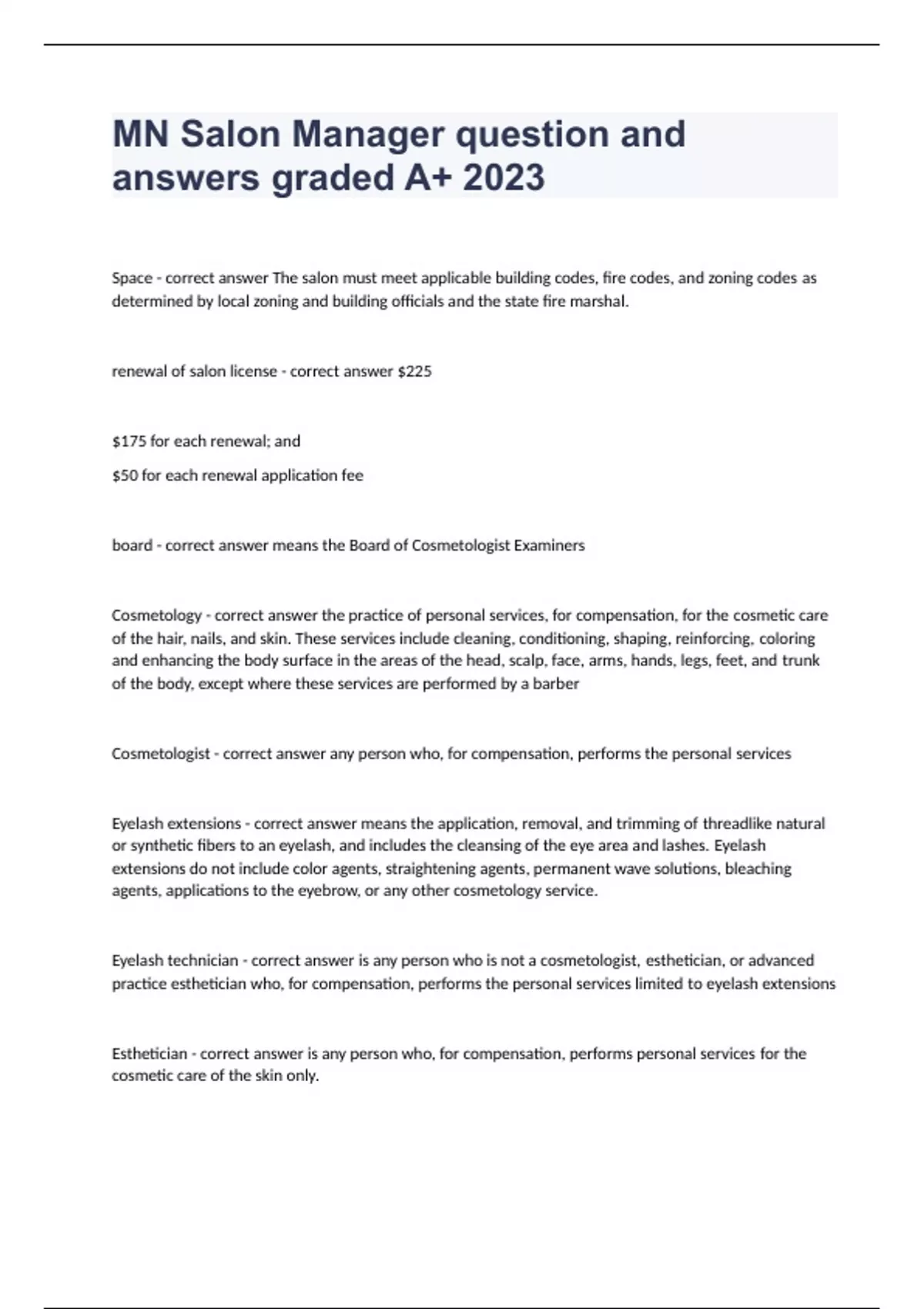 MN Salon Manager question and answers graded A+ 2023 Space - correct answer The salon must meet applicable building codes, fire codes, and zoning codes as determined by local zoning and building officials and the state fire marshal. renewal of salon license - correct answer $225 $175 for each renewal; and $50 for each renewal application fee board - correct answer means the Board of Cosmetologist Examiners Cosmetology - correct answer the practice of personal services, for compensation, for the cosmetic care of the hair, nails, and skin. These services include cleaning, conditioning, shaping, reinforcing, coloring and enhancing the body surface in the areas of the head, scalp, face, arms, hands, legs, feet, and trunk of the body, except where these services are performed by a barber Cosmetologist - correct answer any person who, for compensation, performs the personal services Eyelash extensions - correct answer means the application, removal, and trimming of threadlike natural or synthetic fibers to an eyelash, and includes the cleansing of the eye area and lashes. Eyelash extensions do not include color agents, straightening agents, permanent wave solutions, bleaching agents, applications to the eyebrow, or any other cosmetology service. Eyelash technician - correct answer is any person who is not a cosmetologist, esthetician, or advanced practice esthetician who, for compensation, performs the personal services limited to eyelash extensions Esthetician - correct answer is any person who, for compensation, performs personal services for the cosmetic care of the skin only.