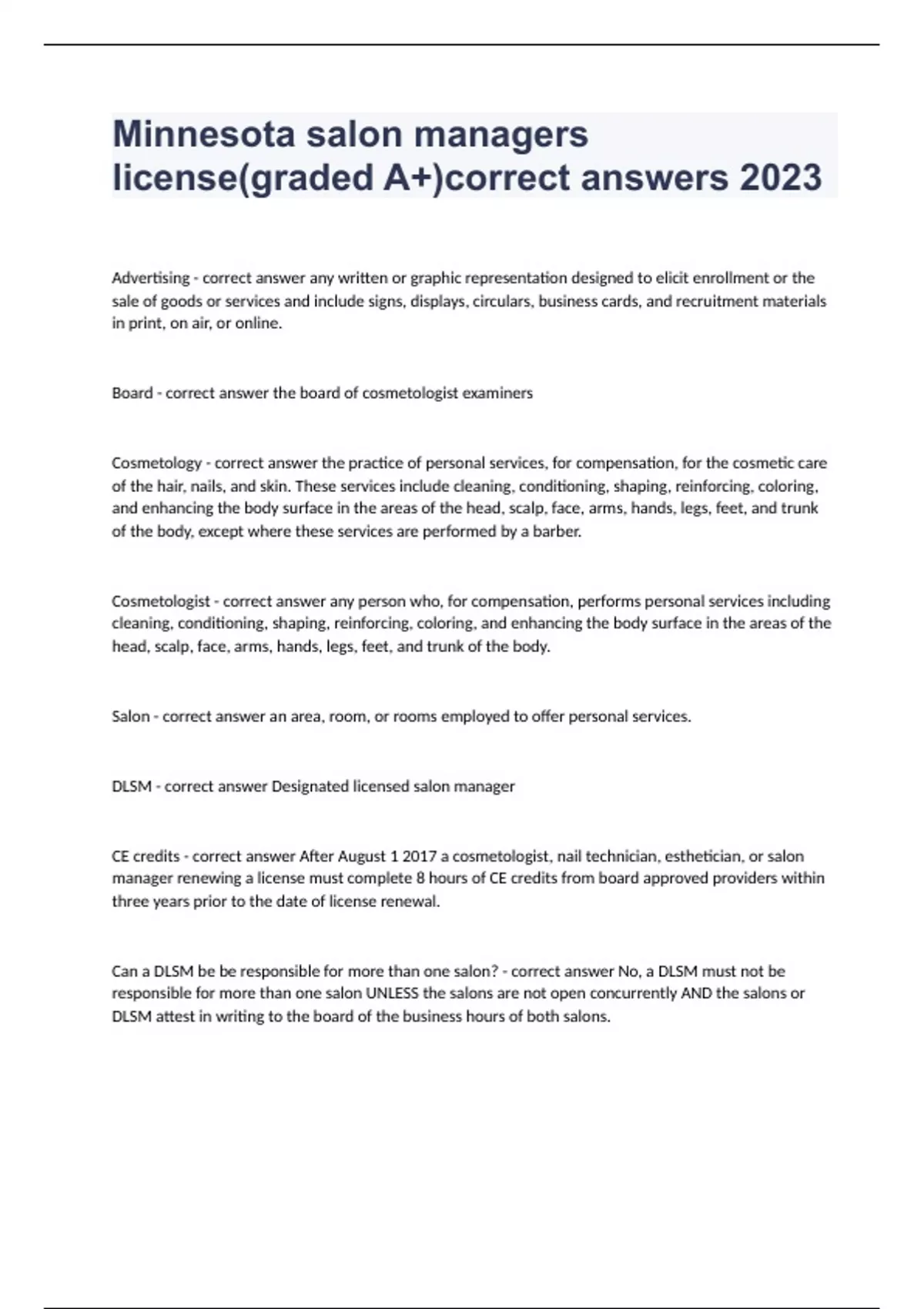 Minnesota salon managers license(graded A+)correct answers 2023Advertising - correct answer any written or graphic representation designed to elicit enrollment or the sale of goods or services and include signs, displays, circulars, business cards, and recruitment materials in print, on air, or online. Board - correct answer the board of cosmetologist examiners Cosmetology - correct answer the practice of personal services, for compensation, for the cosmetic care of the hair, nails, and skin. These services include cleaning, conditioning, shaping, reinforcing, coloring, and enhancing the body surface in the areas of the head, scalp, face, arms, hands, legs, feet, and trunk of the body, except where these services are performed by a barber. Cosmetologist - correct answer any person who, for compensation, performs personal services including cleaning, conditioning, shaping, reinforcing, coloring, and enhancing the body surface in the areas of the head, scalp, face, arms, hands, legs, feet, and trunk of the body. Salon - correct answer an area, room, or rooms employed to offer personal services. DLSM - correct answer Designated licensed salon manager CE credits - correct answer After August 1 2017 a cosmetologist, nail technician, esthetician, or salon manager renewing a license must complete 8 hours of CE credits from board approved providers within three years prior to the date of license renewal. Can a DLSM be be responsible for more than one salon? - correct answer No, a DLSM must not be responsible for more than one salon UNLESS the salons are not open concurrently AND the salons or DLSM attest in writing to the board of the business hours of both salons.