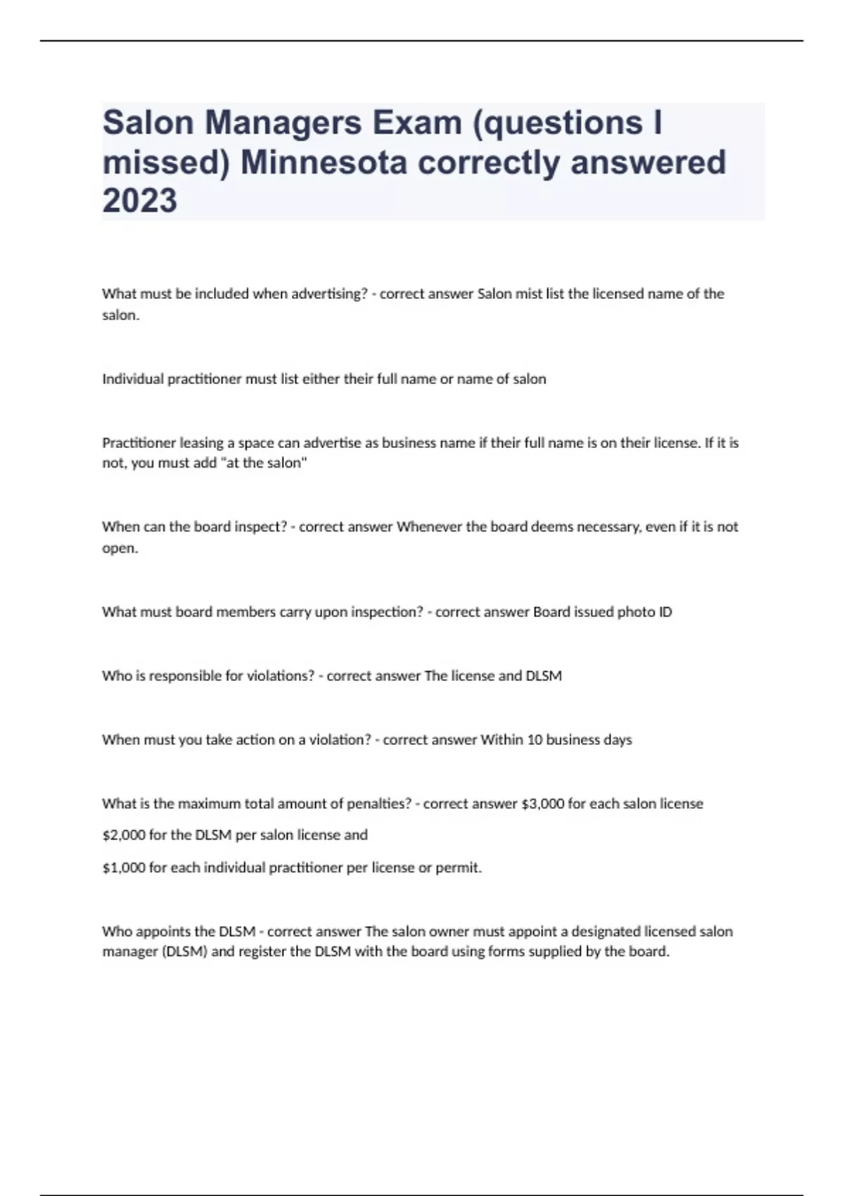 Salon Managers Exam (questions I missed) Minnesota correctly answered 2023 What must be included when advertising? - correct answer Salon mist list the licensed name of the salon. Individual practitioner must list either their full name or name of salon Practitioner leasing a space can advertise as business name if their full name is on their license. If it is not, you must add "at the salon" When can the board inspect? - correct answer Whenever the board deems necessary, even if it is not open. What must board members carry upon inspection? - correct answer Board issued photo ID Who is responsible for violations? - correct answer The license and DLSM When must you take action on a violation? - correct answer Within 10 business days What is the maximum total amount of penalties? - correct answer $3,000 for each salon license $2,000 for the DLSM per salon license and $1,000 for each individual practitioner per license or permit. Who appoints the DLSM - correct answer The salon owner must appoint a designated licensed salon manager (DLSM) and register the DLSM with the board using forms supplied by the board.