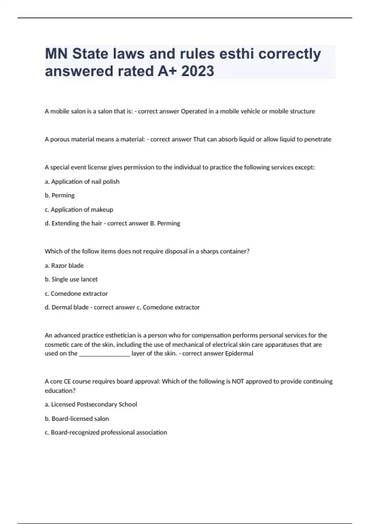MN State laws and rules esthi correctly answered rated A+ 2023A mobile salon is a salon that is: - correct answer Operated in a mobile vehicle or mobile structure A porous material means a material: - correct answer That can absorb liquid or allow liquid to penetrate A special event license gives permission to the individual to practice the following services except: a. Application of nail polish b. Perming c. Application of makeup d. Extending the hair - correct answer B. Perming Which of the follow items does not require disposal in a sharps container? a. Razor blade b. Single use lancet c. Comedone extractor d. Dermal blade - correct answer c. Comedone extractor An advanced practice esthetician is a person who for compensation performs personal services for the cosmetic care of the skin, including the use of mechanical of electrical skin care apparatuses that are used on the _______________ layer of the skin. - correct answer Epidermal A core CE course requires board approval: Which of the following is NOT approved to provide continuing education? a. Licensed Postsecondary School b. Board-licensed salon c. Board-recognized professional association d. Board-licensed school of cosmetology - correct answer b. Board-licensed salon What services are not included in the scope of cosmetology? a. Styling, cutting, and coloring wigs when on a person's head b. Bleaching, and tinting a person's hair, and eyebrows c. Using a razor to remove hair from the head d. Advanced practice esthetic services - correct answer d. Advanced practice esthetic services What is the practice of nail technology? a. A high tech manicurist b. Nail enhancements c. The cosmetic care of the hands, feet, and nails d. The cosmetic care of skin, and nails - correct answer c. The cosmetic care of the hands, feet, and nails What are the 3 levels of infection control? - correct answer Cleaning, disinfection, sterilization "Disinfect" means the use of an antimicrobial pesticide that eliminates harmful - correct answer Viruses, fungi, bacteria on nonporous surfaces During inspections the board inspector must carry a board-issued: - correct answer Photo identification Where must the practitioner conspicuously post their license? - correct answer At each salon where they practice What is the fee for failure to cooperate with an inspection: a. $500 b. $50 c. $1,000 d. $100 - correct answer a. $500