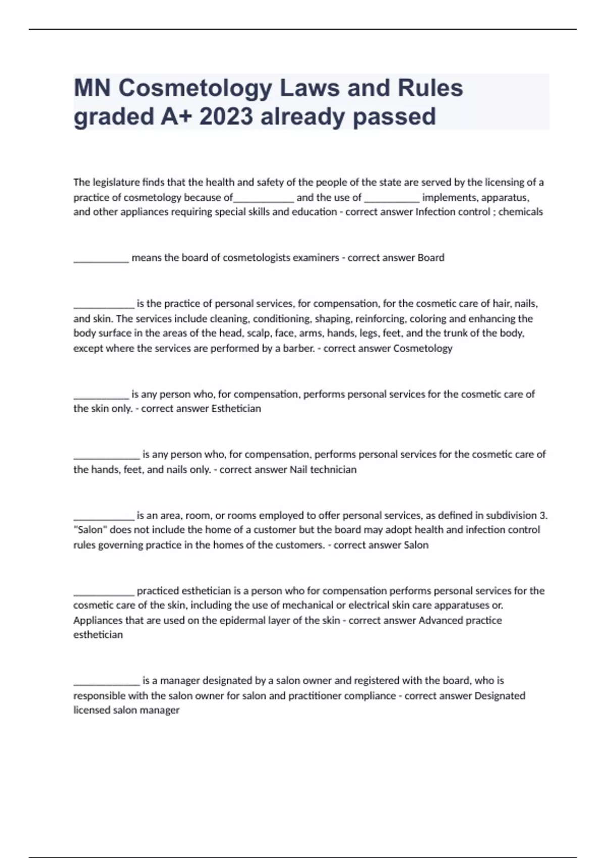 MN Cosmetology Laws and Rules graded A+ 2023 already passedThe legislature finds that the health and safety of the people of the state are served by the licensing of a practice of cosmetology because of___________ and the use of __________ implements, apparatus, and other appliances requiring special skills and education - correct answer Infection control ; chemicals __________ means the board of cosmetologists examiners - correct answer Board ___________ is the practice of personal services, for compensation, for the cosmetic care of hair, nails, and skin. The services include cleaning, conditioning, shaping, reinforcing, coloring and enhancing the body surface in the areas of the head, scalp, face, arms, hands, legs, feet, and the trunk of the body, except where the services are performed by a barber. - correct answer Cosmetology __________ is any person who, for compensation, performs personal services for the cosmetic care of the skin only. - correct answer Esthetician ____________ is any person who, for compensation, performs personal services for the cosmetic care of the hands, feet, and nails only. - correct answer Nail technician ___________ is an area, room, or rooms employed to offer personal services, as defined in subdivision 3. "Salon" does not include the home of a customer but the board may adopt health and infection control rules governing practice in the homes of the customers. - correct answer Salon ___________ practiced esthetician is a person who for compensation performs personal services for the cosmetic care of the skin, including the use of mechanical or electrical skin care apparatuses or. Appliances that are used on the epidermal layer of the skin - correct answer Advanced practice esthetician ____________ is a manager designated by a salon owner and registered with the board, who is responsible with the salon owner for salon and practitioner compliance - correct answer Designated licensed salon manager