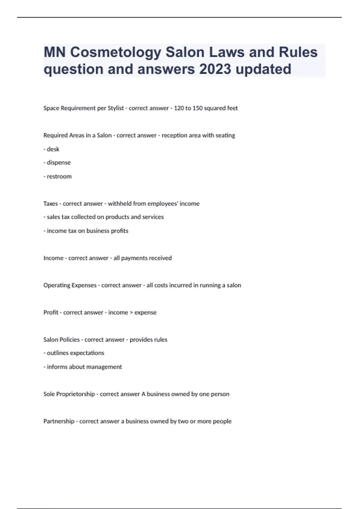 MN Cosmetology Salon Laws and Rules question and answers 2023 updatedSpace Requirement per Stylist - correct answer - 120 to 150 squared feet Required Areas in a Salon - correct answer - reception area with seating - desk - dispense - restroom Taxes - correct answer - withheld from employees' income - sales tax collected on products and services - income tax on business profits Income - correct answer - all payments received Operating Expenses - correct answer - all costs incurred in running a salon Profit - correct answer - income > expense Salon Policies - correct answer - provides rules - outlines expectations - informs about management Sole Proprietorship - correct answer A business owned by one person Partnership - correct answer a business owned by two or more people