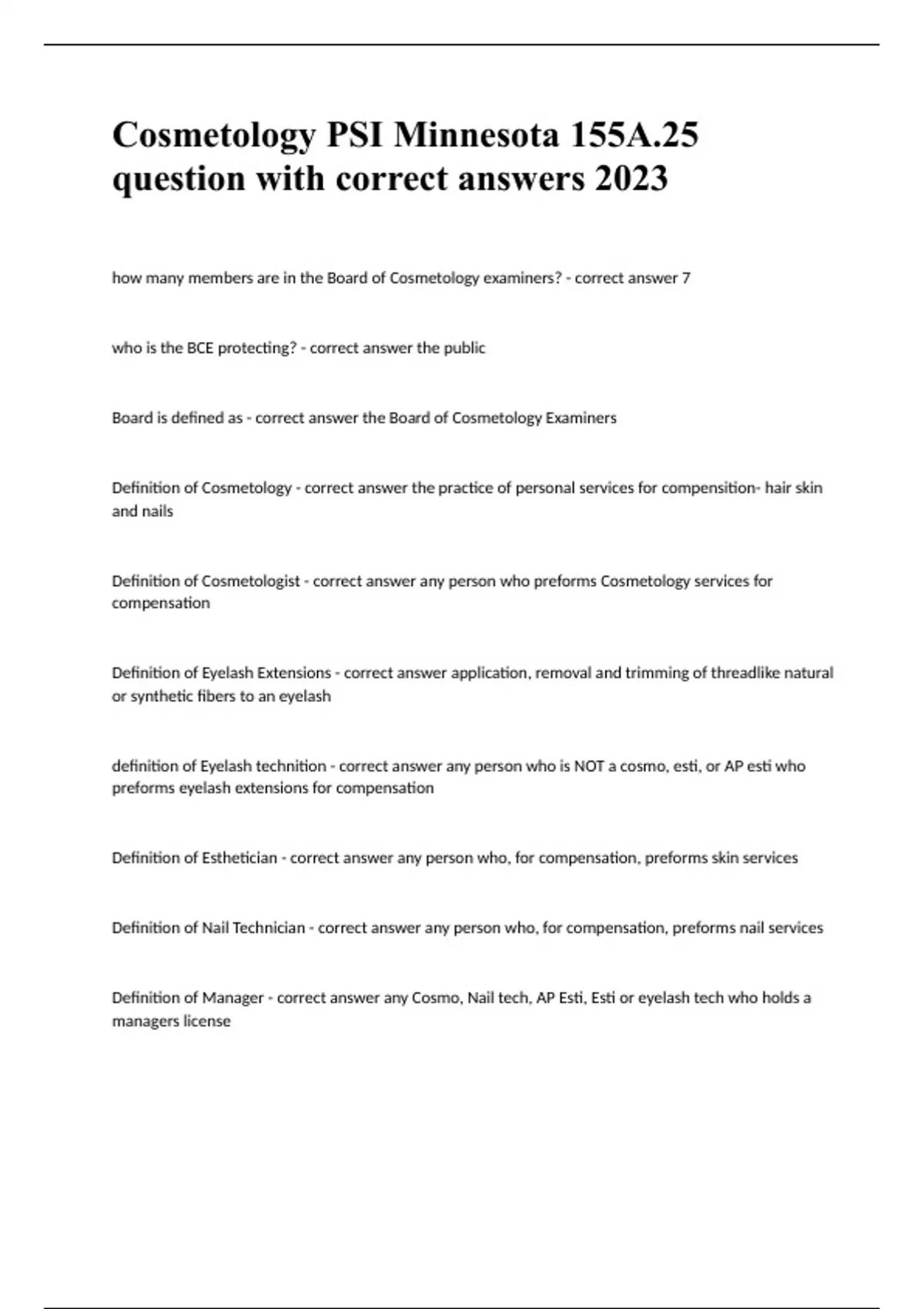 Cosmetology PSI Minnesota 155A.25 question with correct answers 2023how many members are in the Board of Cosmetology examiners? - correct answer 7 who is the BCE protecting? - correct answer the public Board is defined as - correct answer the Board of Cosmetology Examiners Definition of Cosmetology - correct answer the practice of personal services for compensition- hair skin and nails Definition of Cosmetologist - correct answer any person who preforms Cosmetology services for compensation Definition of Eyelash Extensions - correct answer application, removal and trimming of threadlike natural or synthetic fibers to an eyelash definition of Eyelash technition - correct answer any person who is NOT a cosmo, esti, or AP esti who preforms eyelash extensions for compensation Definition of Esthetician - correct answer any person who, for compensation, preforms skin services Definition of Nail Technician - correct answer any person who, for compensation, preforms nail services Definition of Manager - correct answer any Cosmo, Nail tech, AP Esti, Esti or eyelash tech who holds a managers license