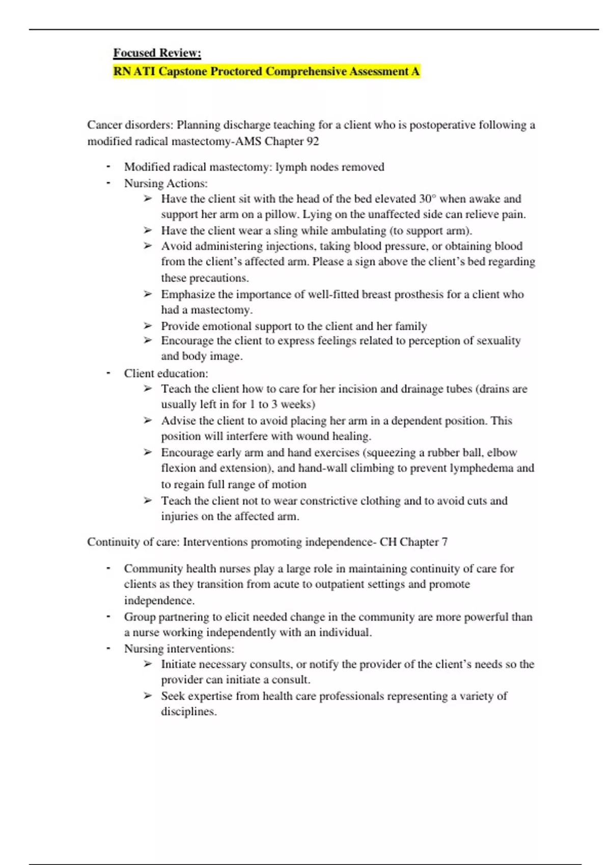 Cancer disorders: Planning discharge teaching for a client who is postoperative following a modified radical mastectomy-AMS Chapter 92 • Modified radical mastectomy: lymph nodes removed • Nursing Actions: Have the client sit with the head of the bed elevated 30° when awake and support her arm on a pillow. Lying on the unaffected side can relieve pain. Have the client wear a sling while ambulating (to support arm). Avoid administering injections, taking blood pressure, or obtaining blood from the client’s affected arm. Please a sign above the client’s bed regarding these precautions. Emphasize the importance of well-fitted breast prosthesis for a client who had a mastectomy. Provide emotional support to the client and her family Encourage the client to express feelings related to perception of sexuality and body image. • Client education: Teach the client how to care for her incision and drainage tubes (drains are usually left in for 1 to 3 weeks) Advise the client to avoid placing her arm in a dependent position. This position will interfere with wound healing. Encourage early arm and hand exercises (squeezing a rubber ball, elbow flexion and extension), and hand-wall climbing to prevent lymphedema and to regain full range of motion Teach the client not to wear constrictive clothing and to avoid cuts and injuries on the affected arm. Continuity of care: Interventions promoting independence- CH Chapter 7 • Community health nurses play a large role in maintaining continuity of care for clients as they transition from acute to outpatient settings and promote independence. • Group partnering to elicit needed change in the community are more powerful than a nurse working independently with an individual. • Nursing interventions: Initiate necessary consults, or notify the provider of the client’s needs so the provider can initiate a consult. Seek expertise from health care professionals representing a variety of disciplines. The nurse educates clients about community resources and self-care measures Coordinate all health care services and resources. Crisis management: Crisis intervention for intimate partner-MH Chapter 29 • A crisis is an acute, time-limited (usually lasting 4 to 6 weeks) event during which a client experiences an emotional response that cannot be managed with the client’s normal coping mechanisms. • Maturational/internal crisis: Achieving new developmental stages, which requires learning additional coping mechanism • Crisis intervention is designed to provide rapid assistance for individuals or groups who have an urgent need Promote a sense of safety by assessing the client’s potential for suicide or homicide Identifying the current problem and directing interventions for resolution Helping the client to set realistic, attainable goals Strategies to decrease anxiety Critical Incident Stress Debriefing is a group approach that can be used with a group of people who have been exposed to a crisis situation Facility protocols: Discovering a medication error- Leadership Chapter 5 • Incident reports are records of unexpected or unusual incidents that affected a client, employee, volunteer, or visitor in a health care facility. In most states, as long as proper safeguards are employed, incident reports cannot be subpoenaed by clients or used as evidence in lawsuits. • Medication errors, procedures/treatment errors, equipment-related injuries/errors, needle stick injuries, client falls/injuries, visitor/volunteer injuries, threat made to client or staff, loss of property. • In the event of an incident that involves a client, employee, volunteer, or visitor, the nurse’s priority is to assess the individual for injuries and institute any immediate care measures necessary to decrease further injury. If the incident was client-related, notify the provider and implement additional tests or treatment as prescribed. Care of special populations: Recommending appropriate referrals- CH Chapter 5 • Community health nurses can link vulnerable clients to relevant resources. • Assist in removing or reducing factors that contribute to stress by referring caretakers of older adult clients to respite services, assisting an unemployed parent in finding employment, or increasing social support networks for socially isolated families. Refer sexual assault or rape survivors to a local emergency department for assessment by a sexual assault abuse team. Caution the client not to bathe following the assault because it will destroy physical evidence. Refer the client to community groups, such as Alcoholics Anonymous (AA) and Narcotics Anonymous if there is an alcohol problem. Make referrals for employee assistance and educational programs to allow clients who are homeless to eliminate the factors contributing to their homelessness. Refer those who have underlying mental health disorders to therapy and counseling. Chronic neuromusculoskeletal disorders: Cross-sensitivities with a latex allergy- NCC Chapter 29 • The child is at an increased risk for a latex allergy. Allergy responses range from urticaria to wheezing, which can progress to anaphylaxis. • A latex allergy is linked to allergies to certain foods (bananas, avocados, kiwi, and chestnuts). • Nursing actions: Assist with testing for allergy Reduce exposure Educate patient and family to avoid household items that contain latex Acute neurological disorders: Transmission precautions- NCC Chapter 10 • Bacterial (septic) meningitis is a contagious infection. Prognosis depends on how quickly care is initiated. Infections caused by bacterial agents: Neisseria meningitidis (meningococcal), Streptococcus pneumoniae (pneumococcal), Haemophilus influenzae type B (Hib). • Isolate the client as soon as meningitis is suspected, and maintain droplet precautions per facility protocol. • Droplet precautions require a private room or a room with clients who have the same infectious disease, ensuring that each client 