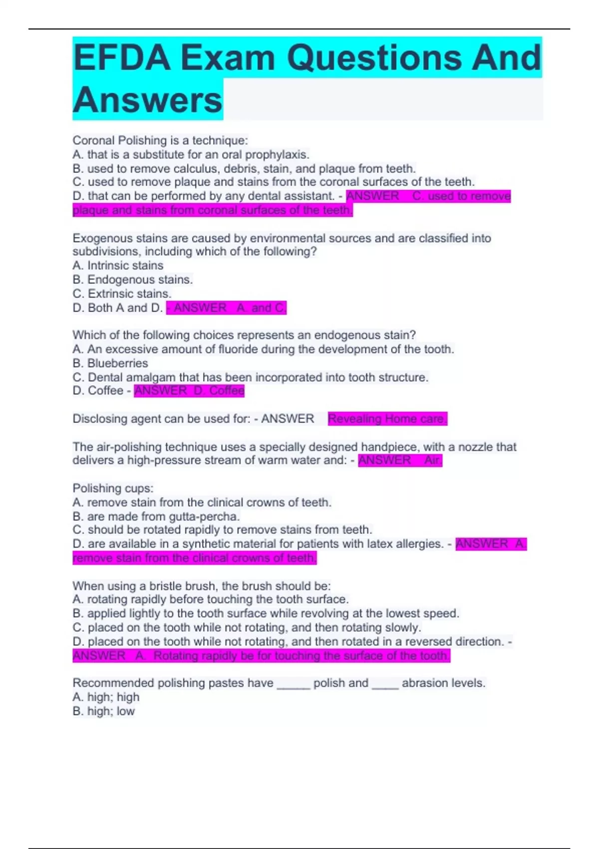 EFDA Exam Questions And Answers Coronal Polishing is a technique: A. that is a substitute for an oral prophylaxis. B. used to remove calculus, debris, stain, and plaque from teeth. C. used to remove plaque and stains from the coronal surfaces of the teeth. D. that can be performed by any dental assistant. - ANSWER C. used to remove plaque and stains from coronal surfaces of the teeth. Exogenous stains are caused by environmental sources and are classified into subdivisions, including which of the following? A. Intrinsic stains B. Endogenous stains. C. Extrinsic stains. D. Both A and D. - ANSWER A. and C. Which of the following choices represents an endogenous stain? A. An excessive amount of fluoride during the development of the tooth. B. Blueberries C. Dental amalgam that has been incorporated into tooth structure. D. Coffee - ANSWER D. Coffee Disclosing agent can be used for: - ANSWER Revealing Home care. The air-polishing technique uses a specially designed handpiece, with a nozzle that delivers a high-pressure stream of warm water and: - ANSWER Air. Polishing cups: A. remove stain from the clinical crowns of teeth. B. are made from gutta-percha. C. should be rotated rapidly to remove stains from teeth. D. are available in a synthetic material for patients with latex allergies. - ANSWER A. remove stain from the clinical crowns of teeth. When using a bristle brush, the brush should be: A. rotating rapidly before touching the tooth surface. B. applied lightly to the tooth surface while revolving at the lowest speed. C. placed on the tooth while not rotating, and then rotating slowly. D. placed on the tooth while not rotating, and then rotated in a reversed direction. - ANSWER A. Rotating rapidly be for touching the surface of the tooth. Recommended polishing pastes have _____ polish and ____ abrasion levels. A. high; high B. high; low D. low; high E. low; low - ANSWER B. High, Low Luting Cement - ANSWER Adhesive Cementing provisionals - ANSWER Temporary cements Zinc phosphate - ANSWER Gives off exothermic reaction. Mix on glass slab Loading provisionals and cast restorations with cement - ANSWER Lightly lined to cover walls (both) Polycarboxylate cement uses and appearence. - ANSWER Looks glassy. Stringy/weblike Types of glass ionomer cements and users - ANSWER 1-Luting, 2-Restorative/erosion Class V, 3- Etched and bonded Composite resin cement - ANSWER Tooth colored, free of plaque and debris, etched and bonded Leaving excess cement behind - ANSWER irritates tissues Influencing factors of cementation - ANSWER Humidity, temp and mixing time Steps to follow before dispensing cement powder - ANSWER "Fluffing" (shaking) Glass Ionomer cement characteristics and appearance - ANSWER Releases fluoride Types of ZOE and uses - ANSWER Type 1 used for provisionals Removing excess cement - ANSWER Don't pull down Use of dental lathe - ANSWER when impressions Laboratory infection control - ANSWER same as normal precausions Gypsum mixing and pouring, troubleshooting - ANSWER makes it weaker Custom tray - thickness of impression materials - ANSWER 3-4mm, use spray, mix w/in 2 minutes