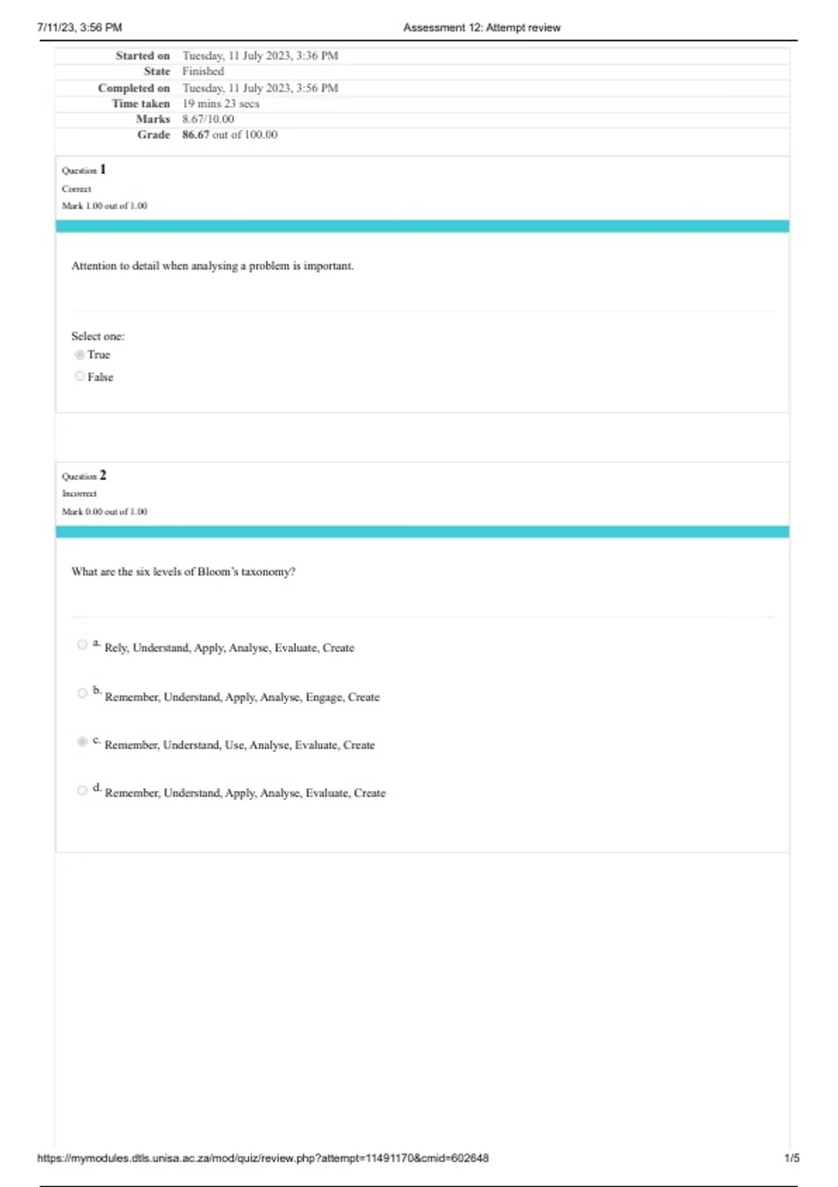 , 7/11/23, 3:56 PM Assessment 12: Attempt review