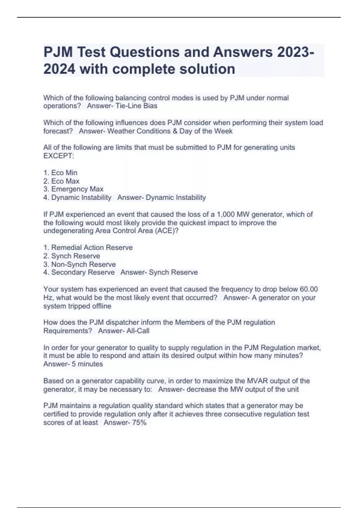 PJM Test Questions and Answers with complete solution