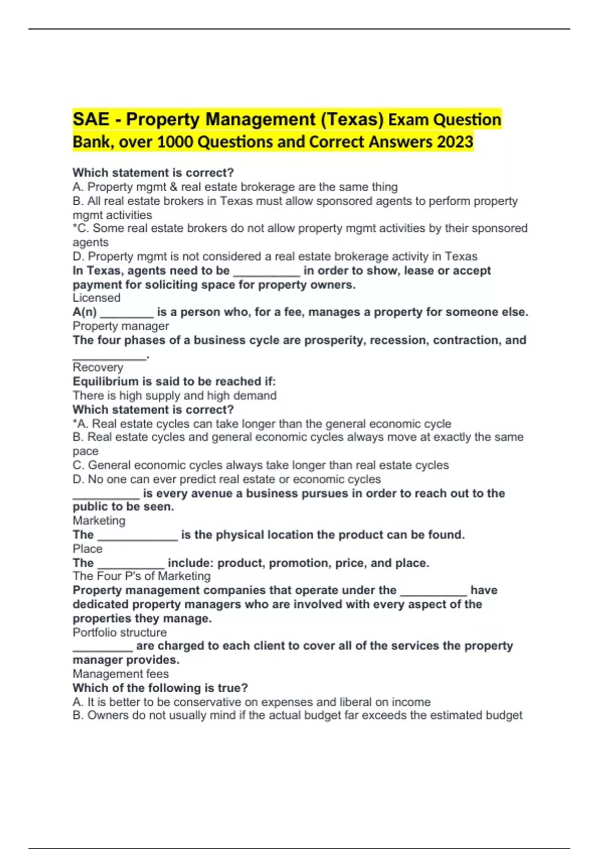 SAE - Property Management (Texas) Exam Question Bank, over 1000 Questions and Correct Answers 2023