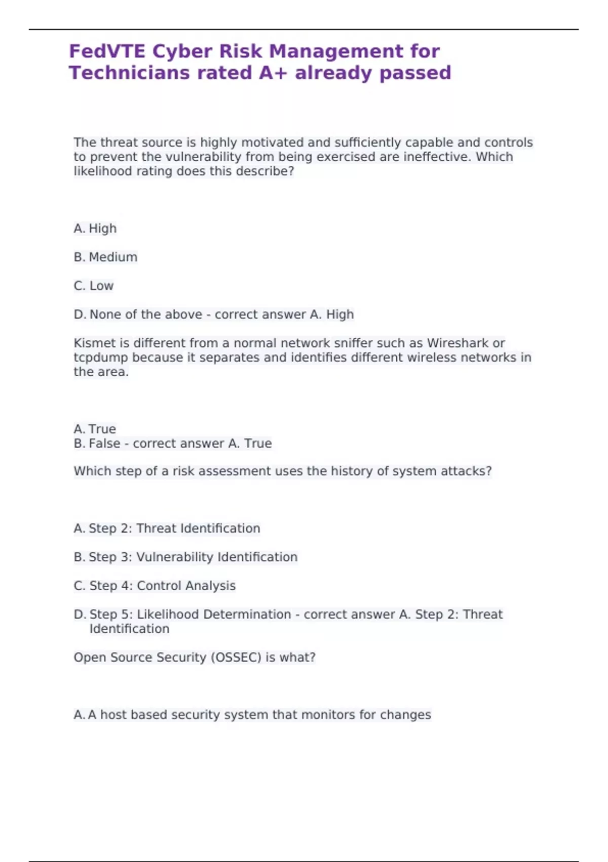 FedVTE Cyber Risk Management for Technicians rated A+ already passed