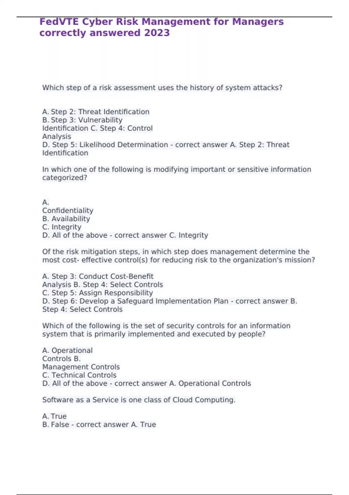 FedVTE Cyber Risk Management for Managers correctly answered 2023