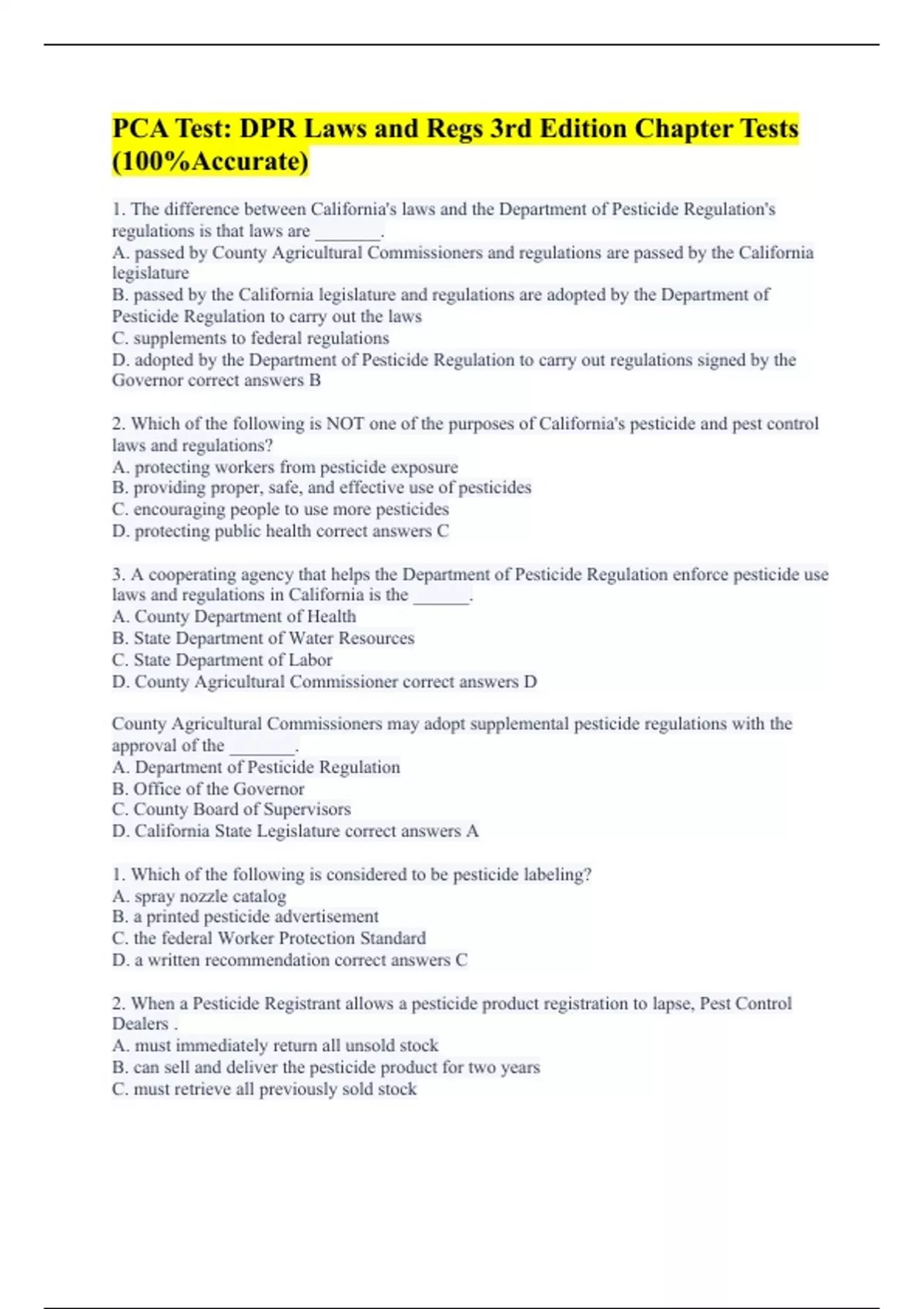 1. The difference between California's laws and the Department of Pesticide Regulation's regulations is that laws are _______. A. passed by County Agricultural Commissioners and regulations are passed by the California legislature B. passed by the California legislature and regulations are adopted by the Department of Pesticide Regulation to carry out the laws C. supplements to federal regulations D. adopted by the Department of Pesticide Regulation to carry out regulations signed by the Governor correct answers B 2. Which of the following is NOT one of the purposes of California's pesticide and pest control laws and regulations? A. protecting workers from pesticide exposure B. providing proper, safe, and effective use of pesticides C. encouraging people to use more pesticides D. protecting public health correct answers C 3. A cooperating agency that helps the Department of Pesticide Regulation enforce pesticide use laws and regulations in California is the ______. A. County Department of Health B. State Department of Water Resources C. State Department of Labor D. County Agricultural Commissioner correct answers D County Agricultural Commissioners may adopt supplemental pesticide regulations with the approval of the _______. A. Department of Pesticide Regulation B. Office of the Governor C. County Board of Supervisors D. California State Legislature correct answers A 1. Which of the following is considered to be pesticide labeling? A. spray nozzle catalog B. a printed pesticide advertisement C. the federal Worker Protection Standard D. a written recommendation correct answers C 2. When a Pesticide Registrant allows a pesticide product registration to lapse, Pest Control Dealers . A. must immediately return all unsold stock B. can sell and deliver the pesticide product for two years C. must retrieve all previously sold stock