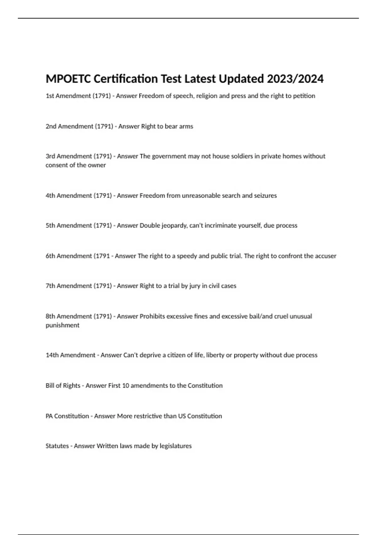 1st Amendment (1791) - Answer Freedom of speech, religion and press and the right to petition 2nd Amendment (1791) - Answer Right to bear arms 3rd Amendment (1791) - Answer The government may not house soldiers in private homes without consent of the owner 4th Amendment (1791) - Answer Freedom from unreasonable search and seizures 5th Amendment (1791) - Answer Double jeopardy, can't incriminate yourself, due process 6th Amendment (1791 - Answer The right to a speedy and public trial. The right to confront the accuser 7th Amendment (1791) - Answer Right to a trial by jury in civil cases 8th Amendment (1791) - Answer Prohibits excessive fines and excessive bail/and cruel unusual punishment 14th Amendment - Answer Can't deprive a citizen of life, liberty or property without due process Bill of Rights - Answer First 10 amendments to the Constitution PA Constitution - Answer More restrictive than US Constitution Statutes - Answer Written laws made by legislatures civil rights violation - Answer Unlawful arrest, search and seizure without probable cause. Holding a prisoner beyond limitations When can officers enter another jurisdiction - Answer Hot pursuit, asked, mutual aid, official business and felony crimes case laws - Answer Written decision of appellate courts deciding actual cases Tort - Answer A violation of the civil law Probable cause - Answer Facts and circumstances that lead a reasonable person to believe a crime had been committed and the suspect committed the crime Three branches of government - Answer Legislative, Executive, Judicial What branch of government do police fall under? - Answer Executive PA Court System - Answer Common Pleas, Circuit, Supreme US Court System - Answer District, circuit, supreme Grading of crimes - Answer Felony, misdemeanor, summary State of mind (Mens Rea) 4 - Answer Mental intent to commit crime - Recklessly - Intentionally - Negligently - Knowingly Where are statutes of limitations found? - Answer Title 42, section 5552 judiciary code Codification - Answer The act or process of rendering laws in written form 2 elements of a crime - Answer Physical act of crime (Actus Reus), Mental intend to do so (Mens Rea) Instrument of a crime - Answer Any instrument that is intended to be used to commit a crime 1st degree murder - Answer 2502 - killing that is premeditated, deliberate and done with malice Felony Crimes - Answer Murder, rape, kidnapping, arson, robbery, burglary, embezzlement, forgery, theft, and perjury Voluntary Manslaughter - Answer 2503 - unlawful killing of a human being in sudden heat of passion upon sufficient legal provocation. Felony 2 Stalking - Answer 2709 - Repeatedly following, harassing, or threatening an individual. M1 Kidnapping - Answer 2901 - The unlawful removal or restraint of a person against his or her will. Rape - Answer 3121 - Penetration however slight, forcible without consent. B Burglary - Answer 3502 - Unlawful entry with intent to commit a crime. F1 Criminal Mischief - Answer Intentional or knowing damage or destruction of property. Police powers derive from - Answer Constitution, case law and statutory law Affiant - Answer Any responsible person capable of taking an oath affirming a criminal complaint 5 Types of bail - Answer ROR Non-Monetary Unsecured Nominal Monetary Venue - Answer Boundaries which a Court has jurisdiction and authority statute of limitations - Answer Summary - 30 Days Misdemeanor- 2 years Felony - 5 years Homicide - no limit Four Corners Rule - Answer No outside evidence may be used against somebody during a search warrant/investigation Search Warrants - Answer Executed within 48 hours Night Time Warrants - Answer How long to file a citation - Answer Within 5 days How long to respond to a citation - Answer Within 10 days Defendant has a right to a preliminary hearing - Answer Within 3-10 days after arrest Time limit for trial - Answer If incarcerated - 180 days Not incarcerated - 365 days Minimum legal proof to justify arrest - Answer Probable cause Determine legality of an arrest - Answer Totality of the circumstances, reasonable person test Mere encounter - Answer Exchange of information between officer and civilian, no level of suspicion required, civilian free to leave at anytime Investigatory Detention - Answer Need reasonable suspicion supported by articulated facts. Reasonable time is 20-30 minutes Custodial Detention - Answer Probable cause is needed, person is under arrest Terry Search - Answer Searching for weapons only. Must establish reasonable suspicion, believe criminal activity is afoot Plain Feel Doctrine - Answer -during frisk, if officer grab something and immediately recognize it, they can seize it Terry search of a car - Answer Search within arms reach unless it's locked, must have a warrant to search trunk Commonwealth v. Mimms - Answer Allowed to order passengers out of a vehicle and pat down for safety Commonwealth v. Brown - Answer Dying declaration