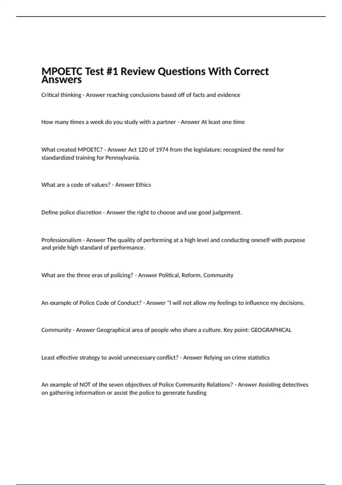 Critical thinking - Answer reaching conclusions based off of facts and evidence How many times a week do you study with a partner - Answer At least one time What created MPOETC? - Answer Act 120 of 1974 from the legislature; recognized the need for standardized training for Pennsylvania. What are a code of values? - Answer Ethics Define police discretion - Answer the right to choose and use good judgement. Professionalism - Answer The quality of performing at a high level and conducting oneself with purpose and pride high standard of performance. What are the three eras of policing? - Answer Political, Reform, Community An example of Police Code of Conduct? - Answer "I will not allow my feelings to influence my decisions. Community - Answer Geographical area of people who share a culture. Key point: GEOGRAPHICAL Least effective strategy to avoid unnecessary conflict? - Answer Relying on crime statistics An example of NOT of the seven objectives of Police Community Relations? - Answer Assisting detectives on gathering information or assist the police to generate funding