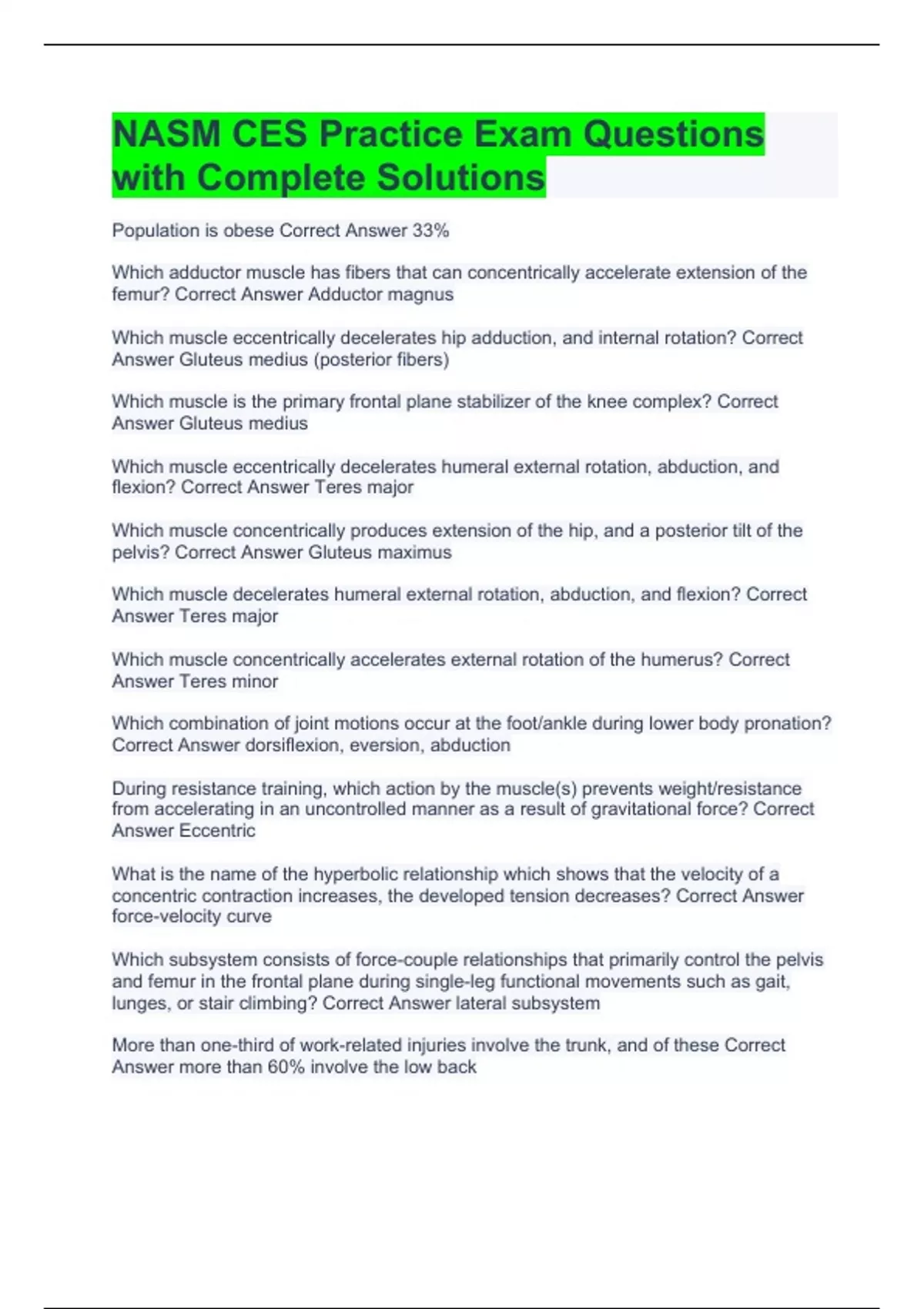 Population is obese Correct Answer 33% Which adductor muscle has fibers that can concentrically accelerate extension of the femur? Correct Answer Adductor magnus Which muscle eccentrically decelerates hip adduction, and internal rotation? Correct Answer Gluteus medius (posterior fibers) Which muscle is the primary frontal plane stabilizer of the knee complex? Correct Answer Gluteus medius Which muscle eccentrically decelerates humeral external rotation, abduction, and flexion? Correct Answer Teres major Which muscle concentrically produces extension of the hip, and a posterior tilt of the pelvis? Correct Answer Gluteus maximus Which muscle decelerates humeral external rotation, abduction, and flexion? Correct Answer Teres major Which muscle concentrically accelerates external rotation of the humerus? Correct Answer Teres minor Which combination of joint motions occur at the foot/ankle during lower body pronation? Correct Answer dorsiflexion, eversion, abduction During resistance training, which action by the muscle(s) prevents weight/resistance from accelerating in an uncontrolled manner as a result of gravitational force? Correct Answer Eccentric What is the name of the hyperbolic relationship which shows that the velocity of a concentric contraction increases, the developed tension decreases? Correct Answer force-velocity curve Which subsystem consists of force-couple relationships that primarily control the pelvis and femur in the frontal plane during single-leg functional movements such as gait, lunges, or stair climbing? Correct Answer lateral subsystem More than one-third of work-related injuries involve the trunk, and of these Correct Answer more than 60% involve the low back