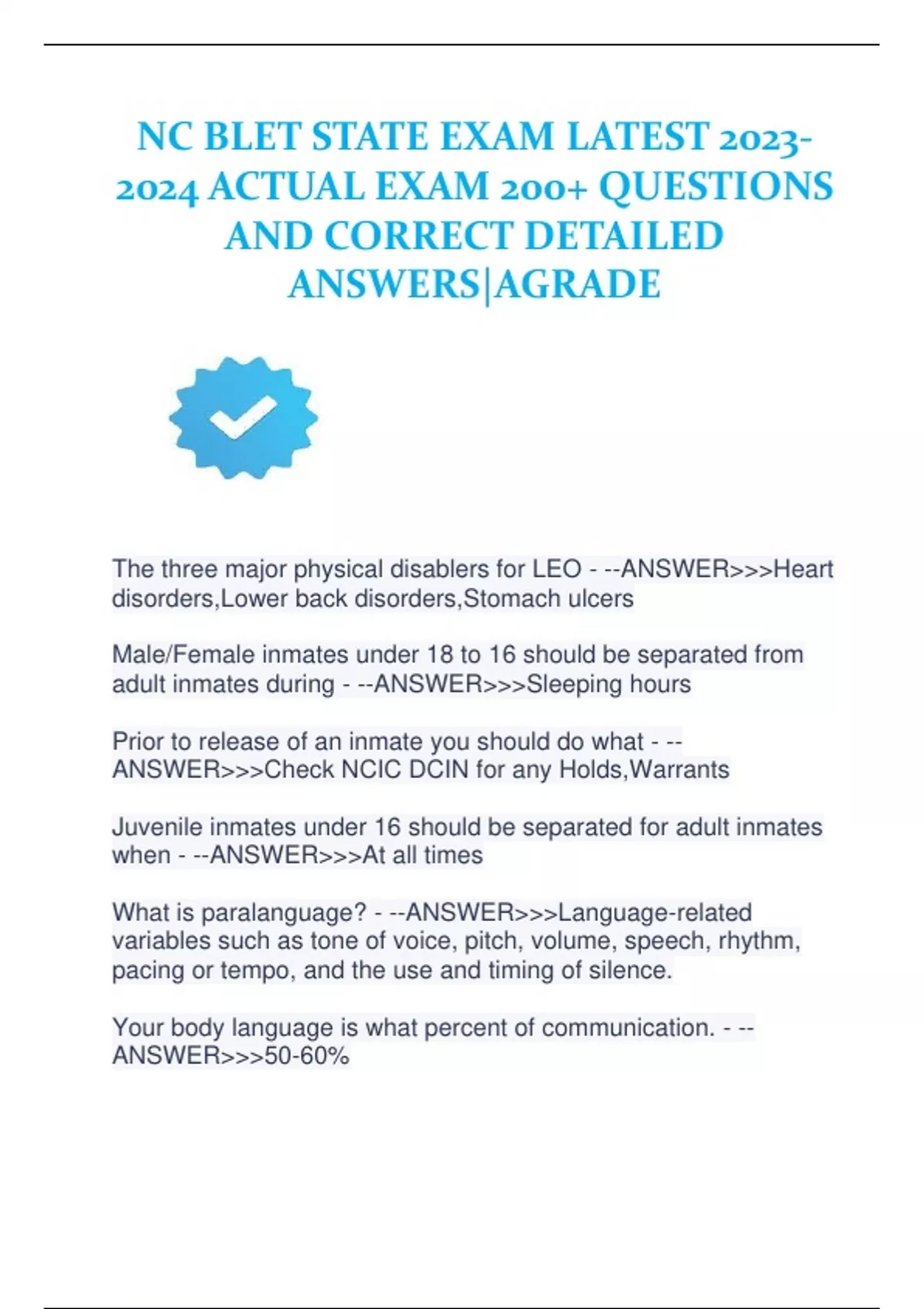 NC BLET STATE EXAM LATEST ACTUAL EXAM 200+ QUESTIONS AND CORRECT DETAILED ANSWERS|AGRADE